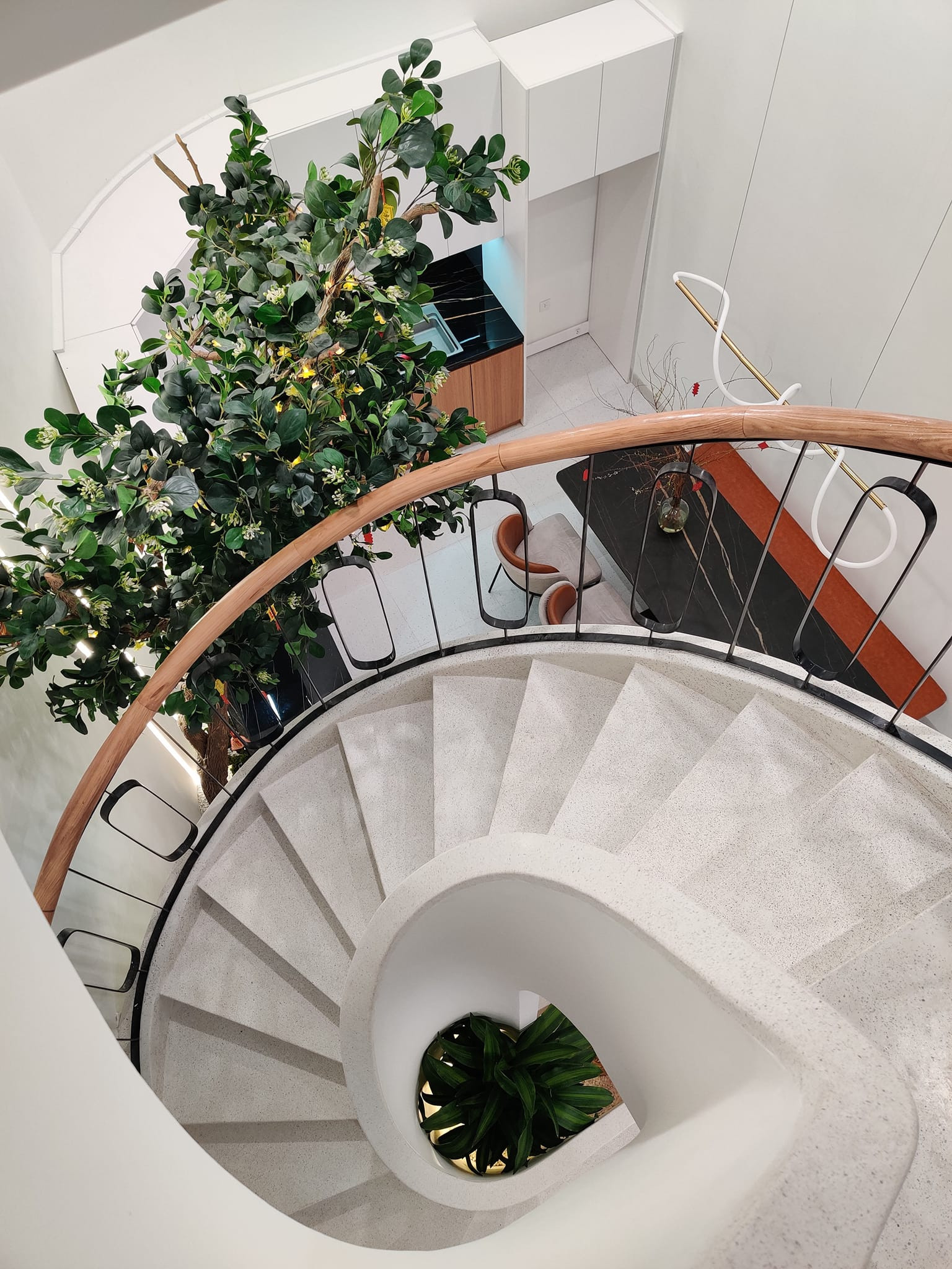 Sự tiếp nối của không gian bếp và khách tạo thành sự xuyên suốt từ ngoài vào trong nhưng vẫn cảm nhận được sự ngăn cách nhờ cầu thang xoắn ốc nằm ở giữa.