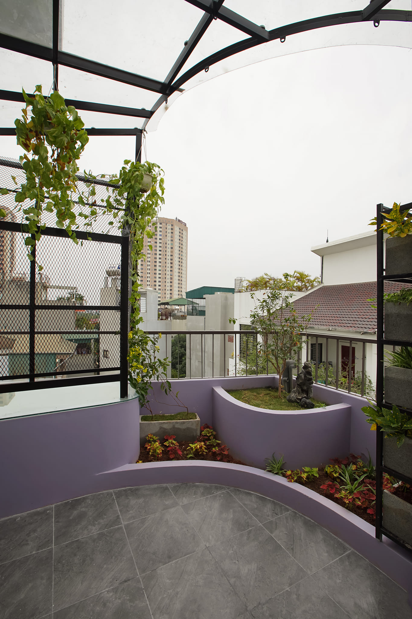 Sân thượng phía sau. Khu vực có cửa, trồng nhiều cây này là khu vệ sinh ngoài trời.