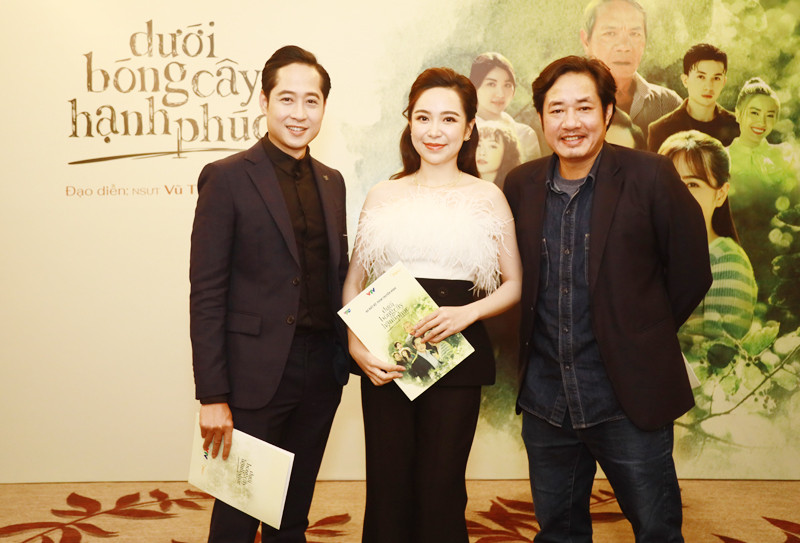 Mạnh Hưng, Kim Oanh và Bùi Như Lai trong buổi ra mắt phimDưới bóng cây hạnh phúc tại Hà Nội. Cả hai chưa lập gia đình nhưng lần đầu sẽ vào vai vợ chồng trong phim mới. Dưới bóng cây hạnh phúc kể vể cuộc đời làm dâu của Son. Là người phụ nữ trong một gia đình toàn đàn ông, Son luôn dành tình cảm và sự quan tâm chân thành cho mọi người. Tuy nhiên, vì quá ôm đồm, cô vô tình gây ra những rắc rối cho gia đình. Bị mọi người chê trách, Son tổn thương, có cảm giác bị ghẻ lạnh, quay lưng dù mình đã sống vì mọi người. Qua nhiều biến cố, Son hiểu rằng những tình cảm cô dành cho gia đình không hề bị xem nhẹ. Những người thân, từ chồng, bố chồng đến những người anh em chồng, có thể không biết nói lời cảm ơn nhưng vì cô, họ có thể làm tất cả mọi điều...Đã đóng nhiều phim truyền hình, đặc biệt là phim của đạo diễn Vũ Trường Khoa nhưng đây là lần đầu tiên Mạnh Hưng đóng vai chính. Mạnh Hưng vốn quen thuộc trong những vai diễn ‘trai đểu’, đặc biệt là vai Hải “bóng” trong Hướng dương ngược nắng. Lần này Mạnh Hưng vào vai Đạt - chồng của Kim Oanh (vai Son) trong Dưới bóng cây hạnh phúc. Đạt say mê công việc, quan niệm thành đạt là phải có vị trí trong xã hội. Anh có phần kiêu ngạo và tỏ ra quan cách với vợ và người trong nhà. Mạnh Hưng chia sẻ anh thường được đạo diễn Vũ Trường Khoa giao cho vai "hãm" nhưng vai Đạt lần này đã bớt "hãm" hơn và sau này thậm chí còn được khán giả thương. Kim Oanh đảm nhiệm vai Son - Son - một người con dâu, người vợ, người mẹ trẻ chân thành có phần ngờ nghệch trong phim. Cô làm dâu trong gia đình có 3 anh em trai. Dù chưa từng lập gia đình và cũng chưa làm mẹ nhưng Kim Oanh được giao đảm nhiệm vai diễn cần nhiều trải nghiệm và tâm lý nặng.Nữ diễn viên cho biết đóng vai nào trong phim của đạo diễn Vũ Trường Khoa nhân vật của cô cũng khổ. Từ người tình của Công Lý trong Những cô gái trong thành phố đến Yến trong phần 1 Thương ngày nắng về và giờ là Son trong Dưới bóng cây hạnh phúc. Vào vai những phụ nữ đau khổ nên Kim Oanh chia sẻ những vai diễn này làm cô sợ lập gia đình. NSND Quốc Trị vào vai bố chồng của Son. Ông nói vai nào cũng mình cũng đau khổ và lần này cũng lại là một vai khổ về nội tâm. NSƯT Bùi Như Lai sau 15 năm làm đạo diễn sân khấu đã quay lại phim truyền hình với vai Tố - người anh cả trong gia đình. Anh nói tuần đầu đóng Dưới bóng cây hạnh phúc rất khủng hoảng và ức chế vì lâu không đóng phim nhưng dần dần anh cũng quen với việc bị chỉ đạo diễn xuất. Hoàng Anh Vũ - người chuyên trị vai nam phụ trên màn ảnh vào vai người em út trong gia đình. Danh là người ham làm giàu, muốn cả nhà phải ngưỡng mộ mình. Danh sĩ diện, thích khoe khoang, muốn phất lên nhanh chóng nhưng rồi đã phạm phải sai lầm lớn. Hoàng Anh Vũ nói anh rất thích vai diễn này vì Danh thực tế, có nét tương đồng với mình bên ngoài. Đóng cặp với Hoàng Anh Vũ là Kiều My. Nữ diễn viên vào vai Tuyết - vợ Danh. Cô ham giàu, sống ảo, muốn cuộc sống hạnh phúc hư vinh như chồng. Kiều My cho hay từ khi đóng phim cô toàn được các đạo diễn giao vai sung sướng và lần này Tuyết chính xác là "sướng quá hóa rồ". Lương Thanh tái xuất màn ảnh kể từ phim 11 tháng 5 ngày. Cô nói lâu lắm mới được đi đóng phim. Lần này Lương Thanh vào vai Tơ, một cô gái quê hiền lành chăm chỉ - mẫu người Tố luôn tìm kiếm. Huyền Thạch vào vai Nhài trong Dưới bóng cây hạnh phúc. Cô nói đây là vai có tính cách mình thích nhất từ trước đến nay, đóng vai trò như nữ siêu anh hùng chuyên đi giải quyết rắc rối của người khác mà ở đây là Son - bạn thân của Nhài. Dàn diễn viên trong buổi ra mắt phim. Dưới bóng cây hạnh phúc sẽ lên sóng VTV1 vào 21h từ thứ 2 đến thứ 6 hàng tuần trên VTV1, ngay sau khi Mẹ rơm kết thúc.