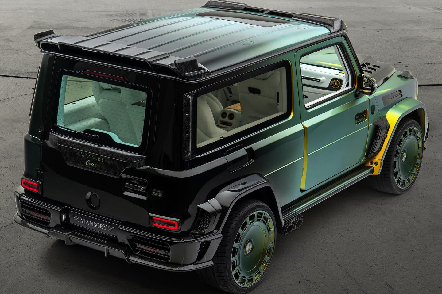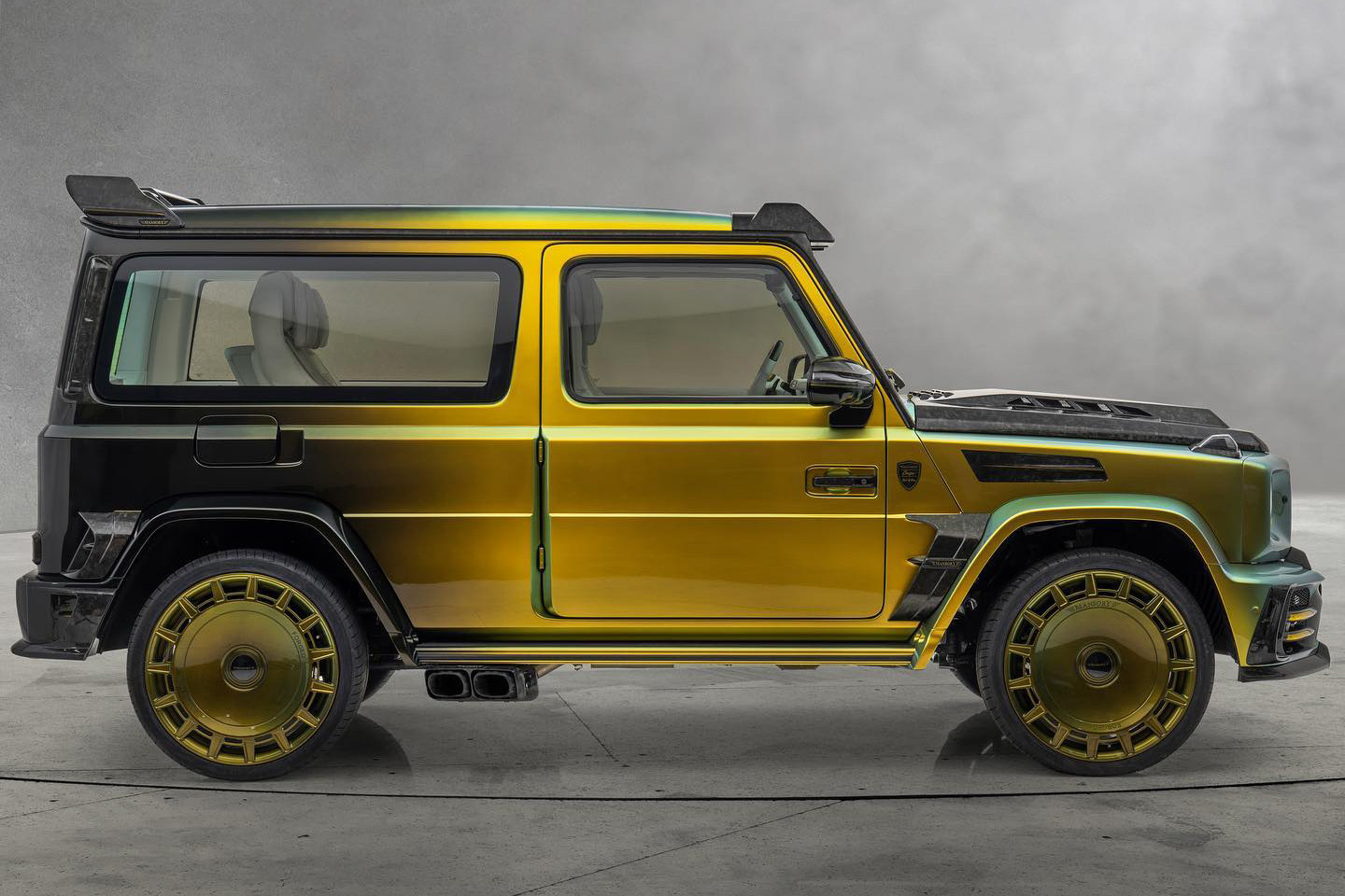 Đối với G-Class, Mansory đã bắt đầu bằng việc loại bỏ cả 4 cửa, di chuyển cột B ra phía sau để tăng kích thước cửa ra vào cho hàng ghế trước. Để tăng sự thú vị, hãng độ xe này còn chuyển bản về ra phía sau tạo thành cửa tự sát giống của những chiếc Rolls-Royce. Kính bên làm liền mạch thay vì tách ô.