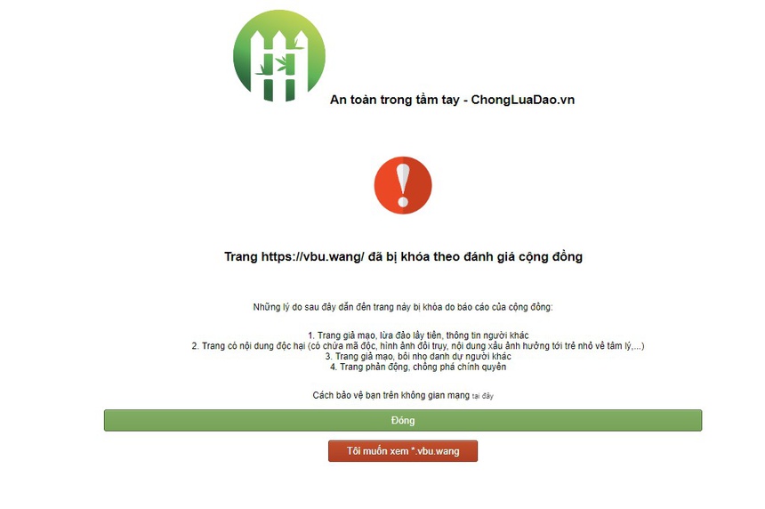 Nền tảng chongluadao.com cảnh báo vbu.wang là website giả mạo, lừa đảo. |
