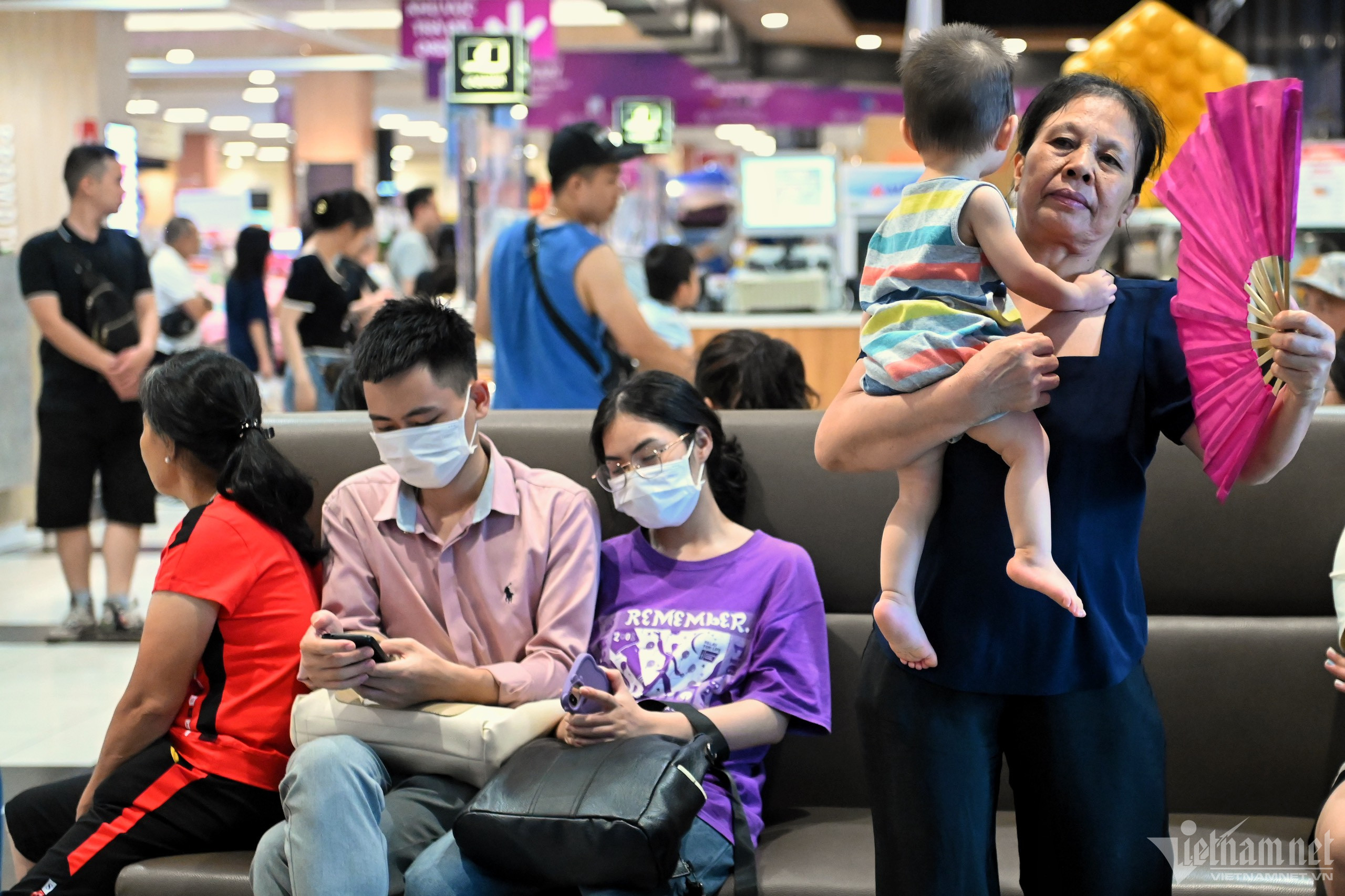 Một trung tâm thương mại ở quận Long Biên (Hà Nội) chật kín người trưa ngày 3/6. Phần lớn khách là các gia đình, nhóm bạn trẻ đến để ăn uống, mua sắm đồng thời tránh nóng.