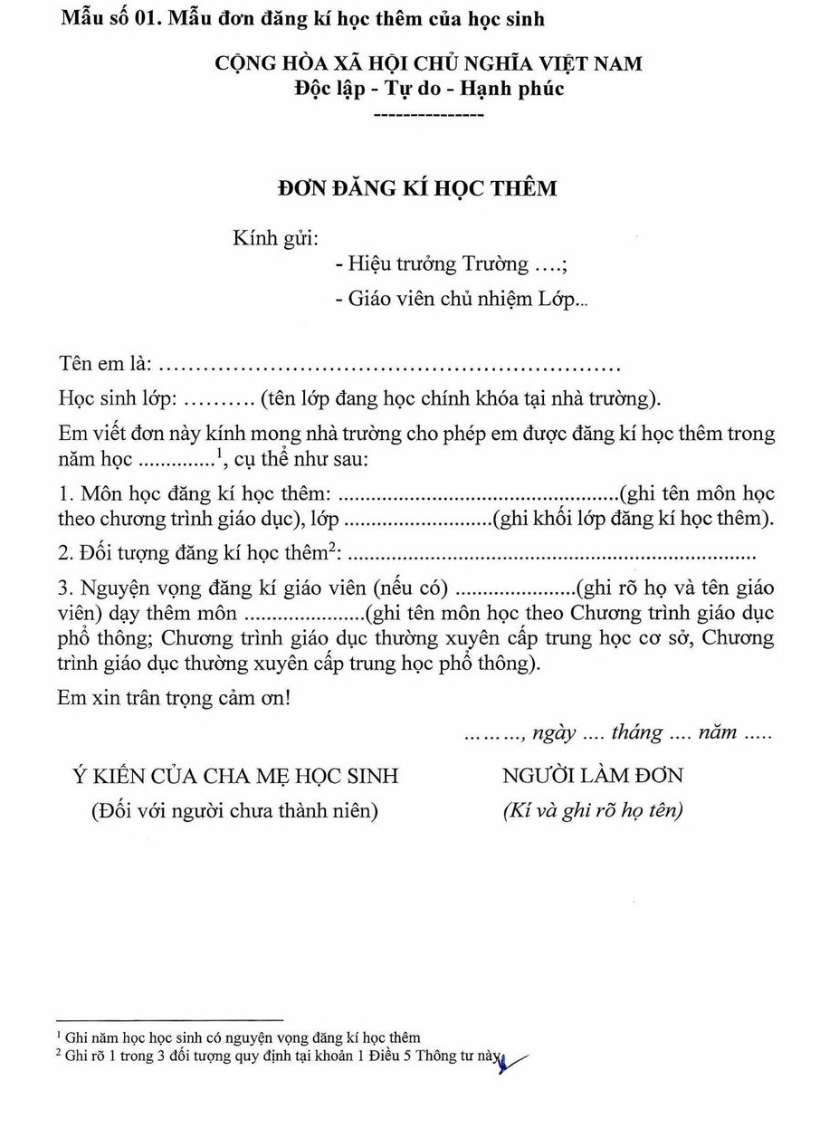 Mẫu đơn đăng ký học thêm theo từng môn học ở từng khối lớp cho học sinh như sau: