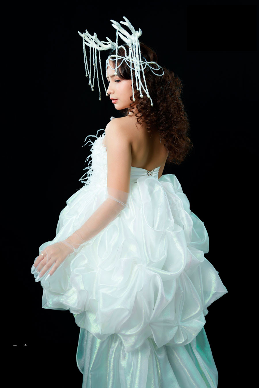 Bên cạnh đàn chị Thu Quỳnh, mẫu nhí 13 tuổi Bảo Châu tự tin sải bước trình diễn thời trang.