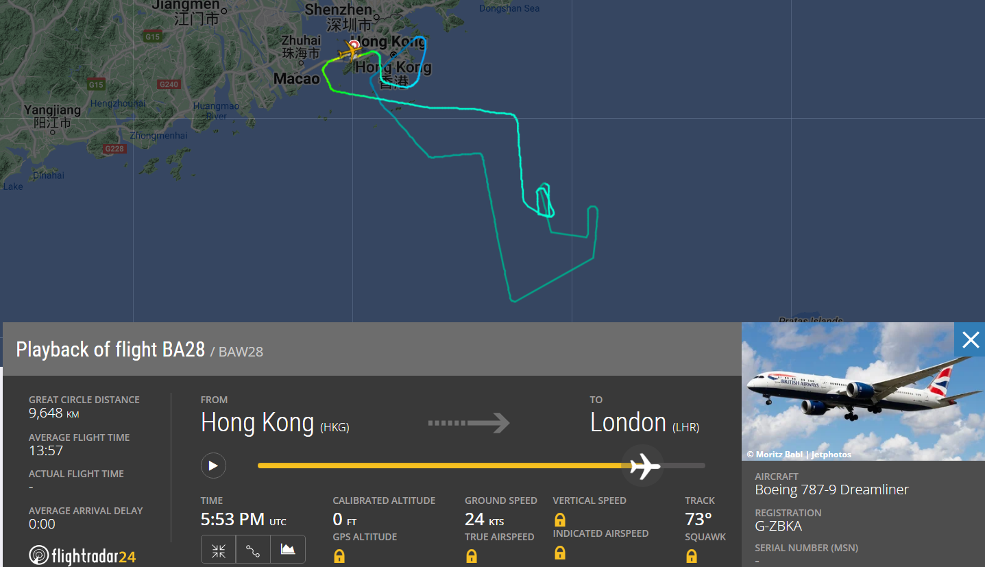 Dữ liệu từ trang web theo dõi hành trình chuyến bay FlightRadar24 cho thấy, chuyến bay BA28 của British Airways cất cánh từ sân bay quốc tế Hồng Kông vào khoảng 3:59 chiều (giờ địa phương) ngày 15/9. Sau khi cất cánh được khoảng 11 phút, máy bay bắt đầu mất độ cao từ 16.000 feet xuống mực bay thấp hơn.