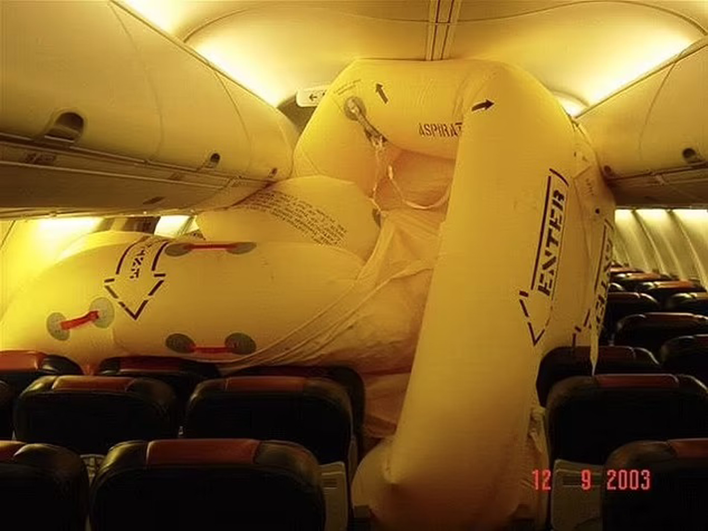 Khi cầu trượt phồng lên, nó đẩy một tấm ván ra khỏi cửa, đập vào thành viên phi hành đoàn 'như một túi khí'.