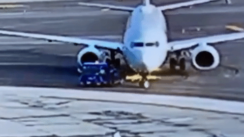 Khoảnh khắc chiếc Boeing 737 của Hãng hàng không Mỹ đã chèn lên một xe kéo khi đang được kéo về điểm đón khách tại sây bay LaGuardia ở New York, Mỹ.
