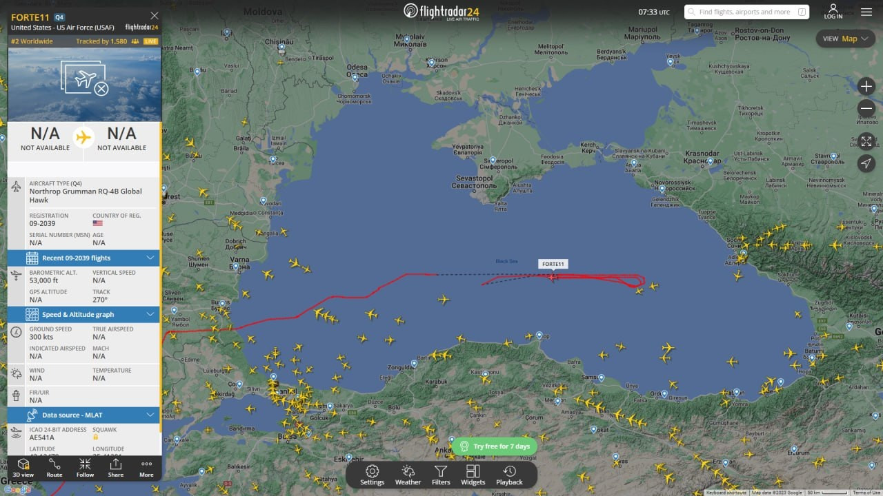 Trước cuộc tấn công một ngày, Flightradar24 cũng phát hiện máy bay trinh sát điện tử Lockheed EP-3E Aries II của Mỹ gần không phận gần Crưm trong vài giờ.