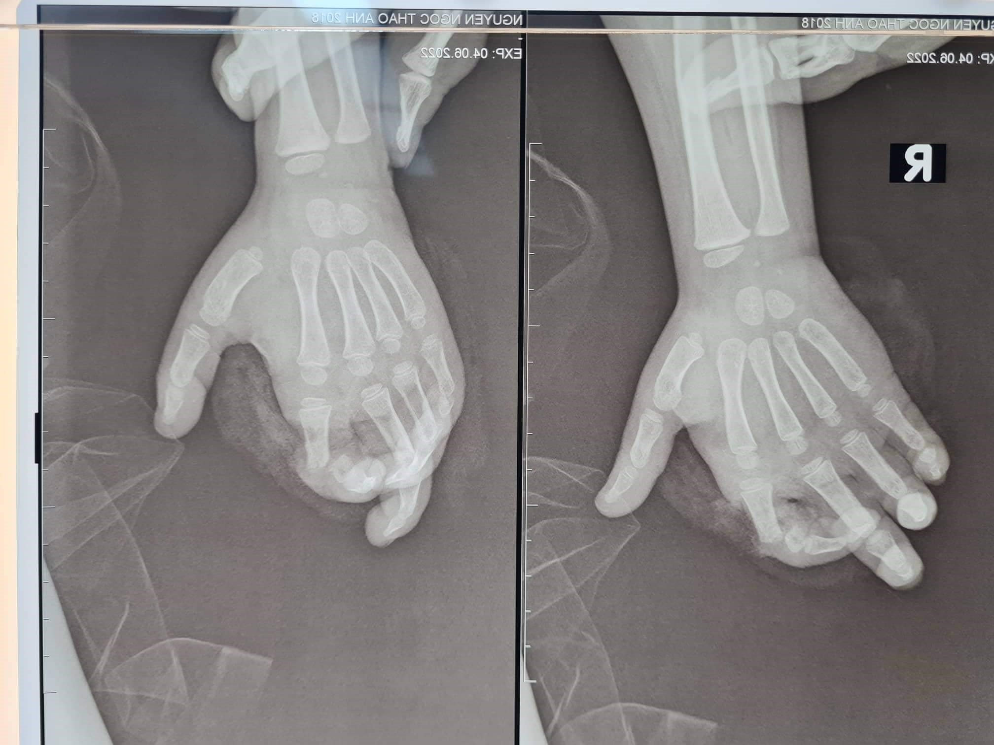 Bệnh nhi là N.T.A (2018, Hà Nội) vừa được các bác sĩ khoa Chấn thương Chi trên và Vi phẫu thuật, Viện Chấn thương Chỉnh hình, Bệnh viện Trung ương Quân đội 108 phẫu thuật bàn tay.