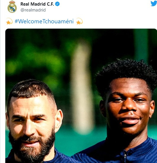 Chẳng thế mà ở thông báo ký thành công Tchouameni vài ngày trước, tài khoản twitter chính thức Real Madrid cố tình cắt hình Tchouameni bên cạnh Benzema từ tấm hình 3 người, gồm Mbappe trong đó.