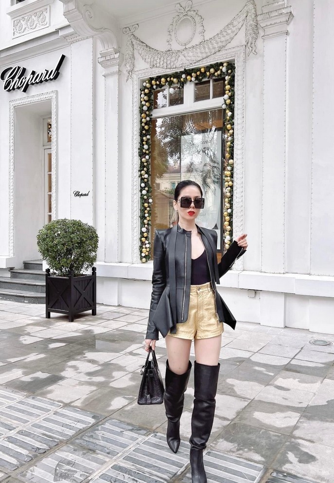 | Lệ Quyên diện đồ ngắn cũn dạo phố trong tiết trời rét ở Hà Nội. |