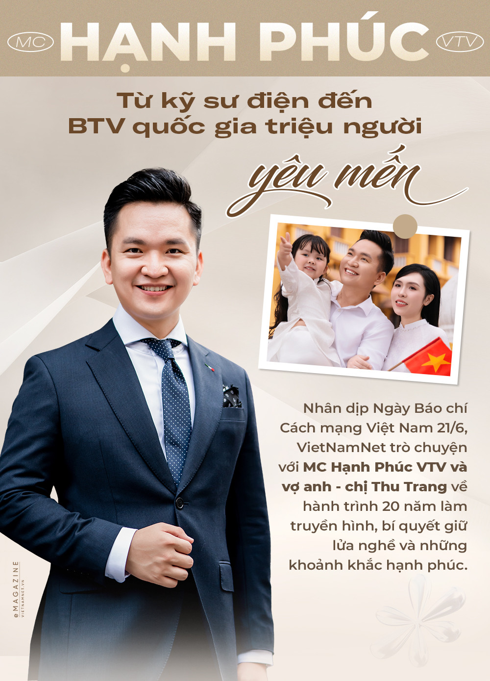 MC Hạnh Phúc: Tôi bắt đầu làm truyền hình từ năm 2005. Lần đầu tiên lên sóng VTV ở chương trình dành cho thiếu nhi. Và đúng 10 năm sau đó tôi có bước chuyển mình khi lần đầu lên sóng Chuyển động 24h vào năm 2015. Chương trình đúng ngày Quốc tế hạnh phúc, chủ đề xuyên suốt bản tin cũng là hạnh phúc - giống như định sẵn để dành riêng cho mình vậy.