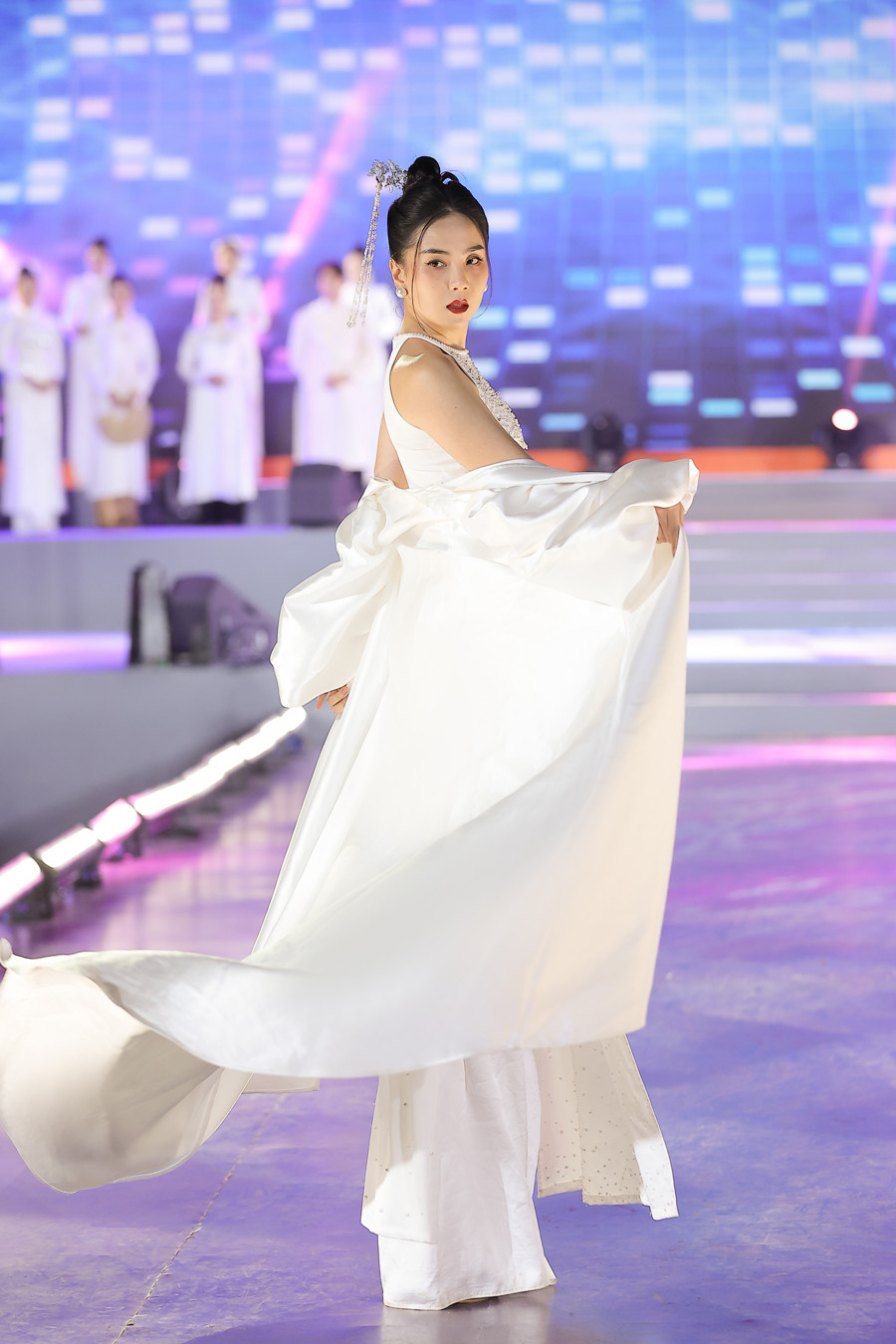 Với vị trí vedette, MC Mai Ngọc được giao mặc bộ áo dài cách điệu với phần vai trần và những hạt ngọc trai đính kết tinh tế. Ngoài ra, thiết kế còn có thêm áo choàng và chiếc trâm cài tóc tạo khiến Mai Ngọc lộng lẫy và đài các. Cô nhận được nhiều tràng vỗ tay cổ vũ với phong cách diễn cuốn hút khi đã lâu mới trở lại trình diễn thời trang