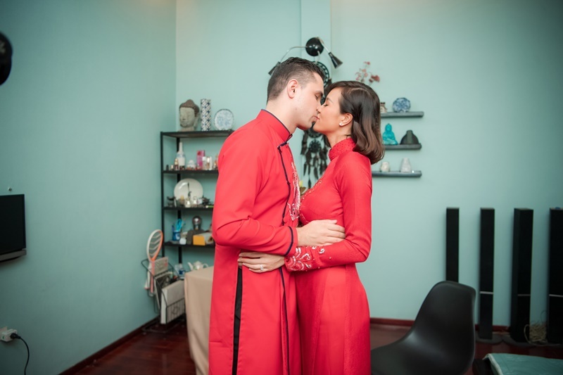 Sáng 15/6, lễ rước dâu của Phương Mai diễn ra tại nhà riêng, nữ MC đã không kìm được xúc động khiến chú rể phải liên tục lau nước mắt cho.