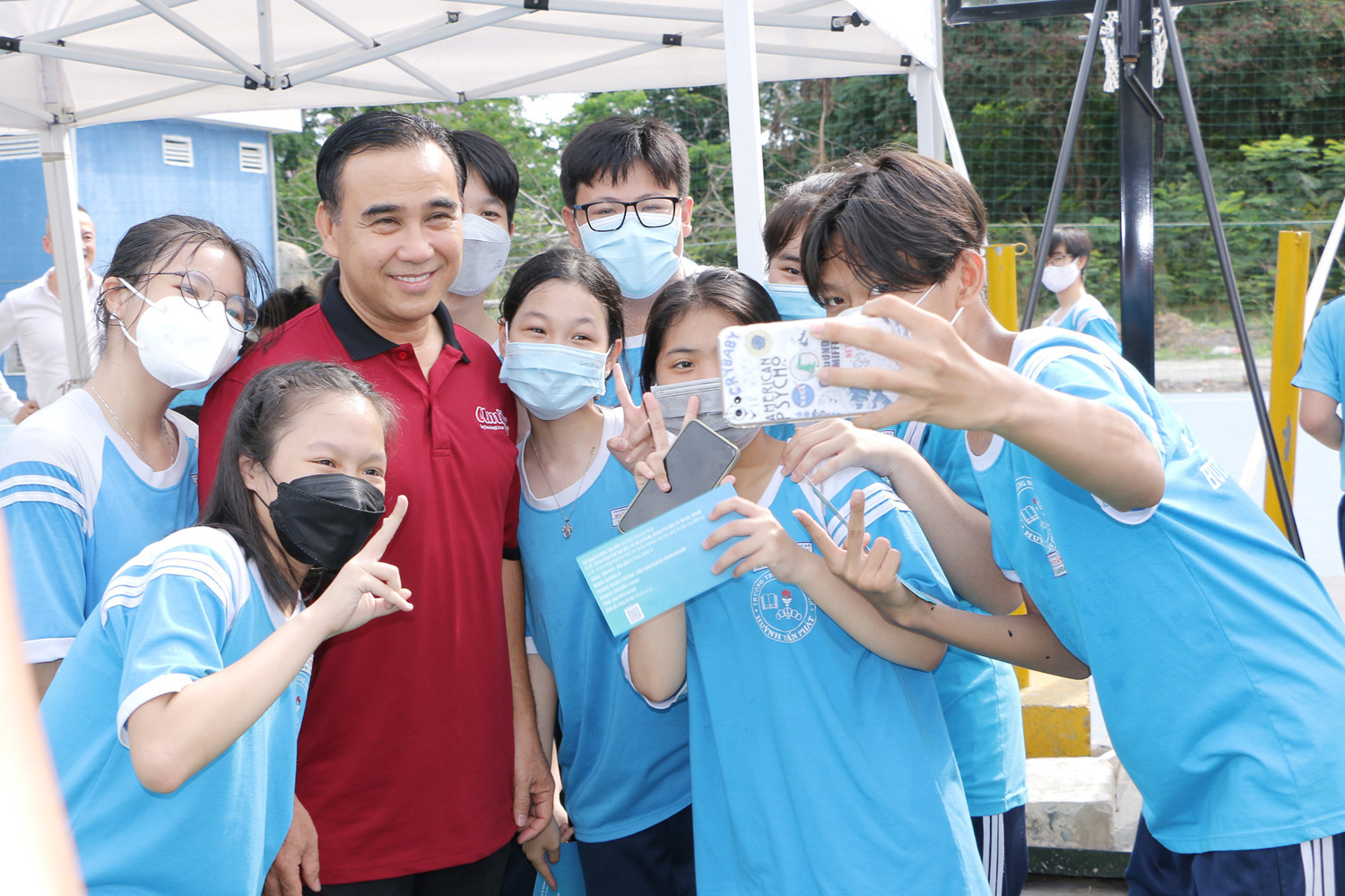 Quyền Linh đi dép tổ ong, các em học sinh vây kín xin chụp ảnh.