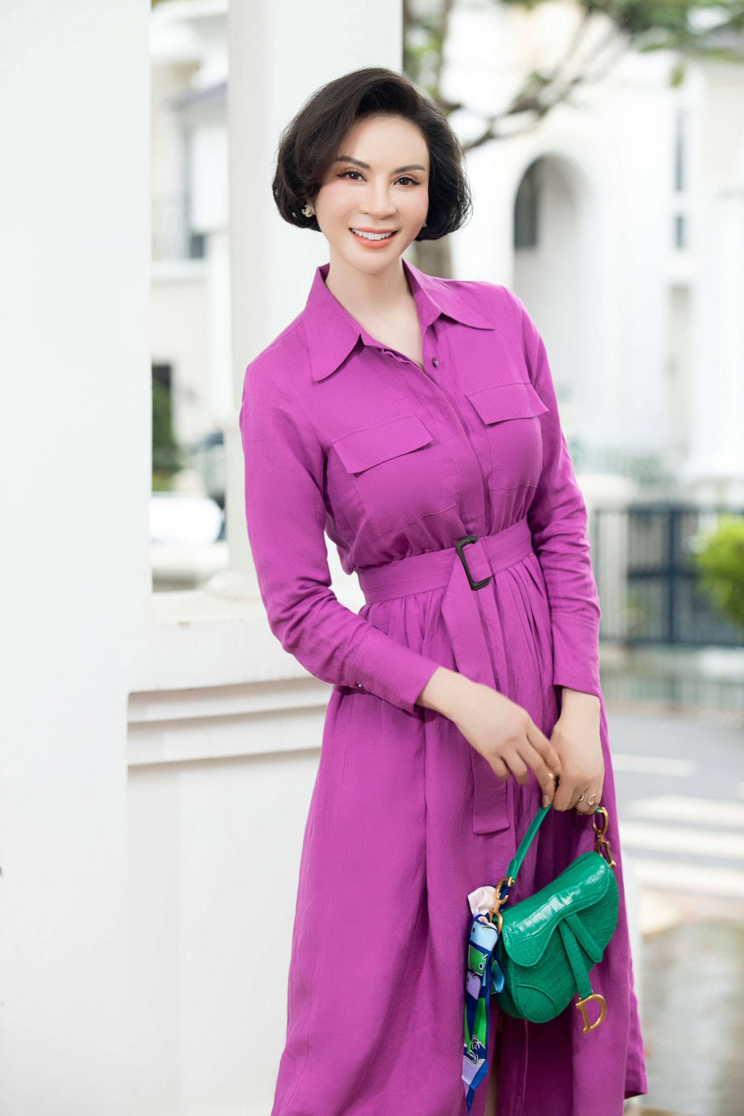 Người đẹp sinh năm 1973 không ít lần chứng minh phụ nữ vẫn có thể trở nên yêu kiều, sexy dù không cần khoe nhiều da thịt. Chiếc đầm sơ mi màu tím này là một ví dụ điển hình.