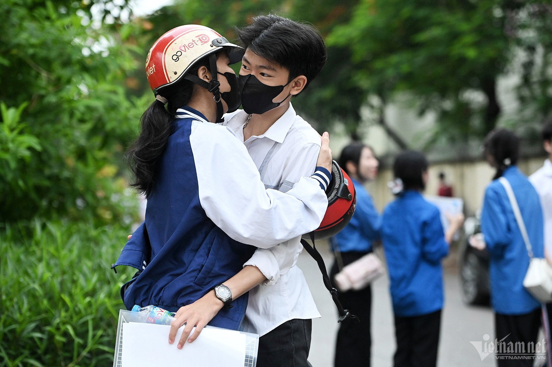 Tại điểm thi THCS Chu Văn An, ngay từ 6h15, nhiều phụ huynh đưa con đi thi không quên dành cho sĩ tử những cái ôm thật chặt và lời chúc làm bài tốt.