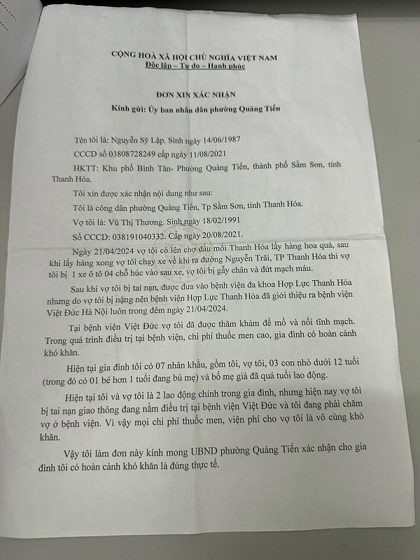 Phòng CTXH Bệnh viện Việt Đức xác nhận: Bệnh nhân Vũ Thị Thương (33 tuổi) bị tai nạn giao thông, nhập viện trong tình trạng nặng. Hiện bệnh nhân đã phẫu thuật lấy huyết khối và tạo hình ngã ba động mạch khoeo, tuy nhiên vẫn cần điều trị lâu dài. Hoàn cảnh bệnh nhân khó khăn, chồng là lao động tự do, các con còn nhỏ trong độ tuổi đi học.