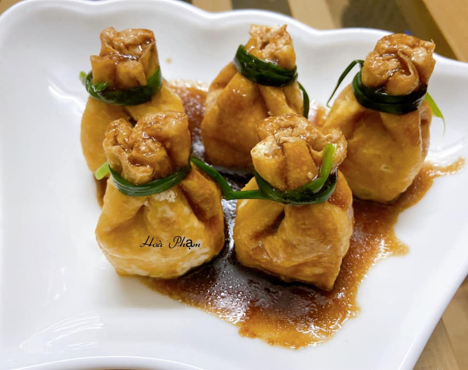 Cách làm: Chiên đậu ngập dầu (chiên cả bìa), sau đó để nguội. Trần hành qua nước sôi cho dai để dễ buộc.