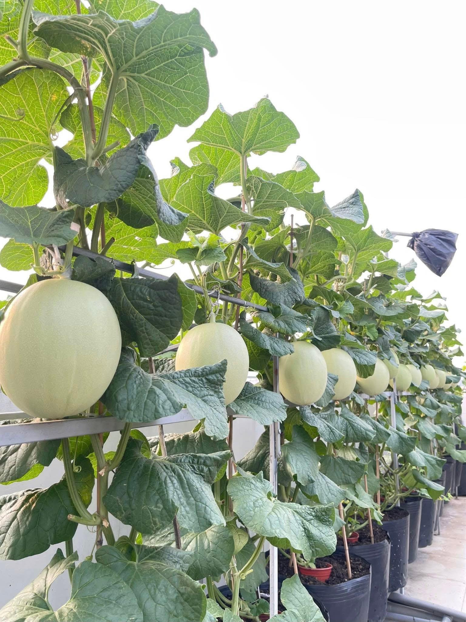 Hình ảnh mấy chục trái dưa lưới to đều, thẳng hàng tăm tắp, dưa hấu nặng trĩu, vỏ căng bóng, "nằm vắt vẻo sưởi nắng trên võng" do chị Nhung chia sẻ gần đây nhận được “bão like”.