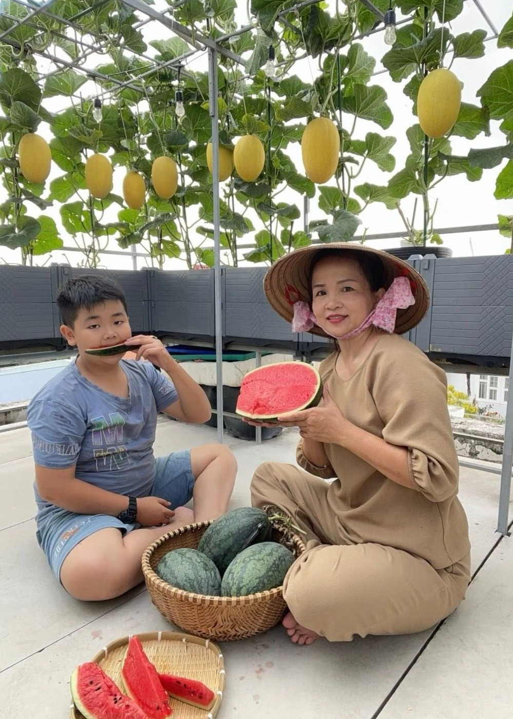 Cả gia đình đều thích ăn dưa hấu, dưa gang nên năm 2022, chị quyết tâm biến sân thượng thành một "nông trại trồng dưa" thu nhỏ, vừa có trái tươi ngon, an toàn, vừa có không gian xanh mát, đẹp mắt.