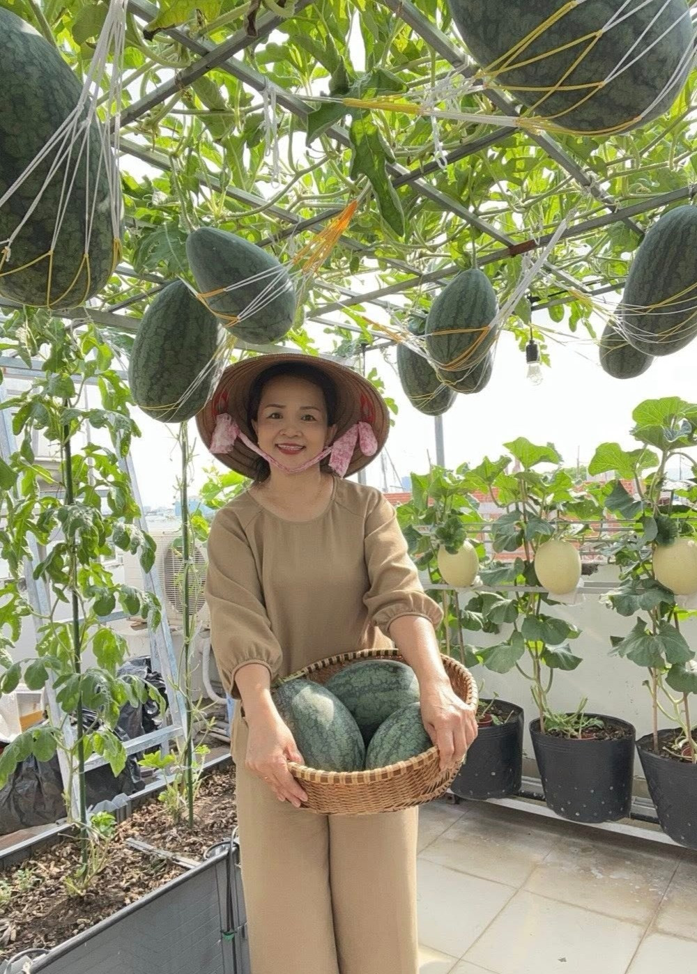 Để khu vườn thêm đẹp, chị Nhung còn học cách làm ổ hay võng cho dưa, rồi mua dây về đan. Vườn nằm trên tầng 4, thường gặp mưa to và gió lớn nên những chiếc võng giúp bảo vệ hữu hiệu cho quả khi to, tránh xoắn cuống.