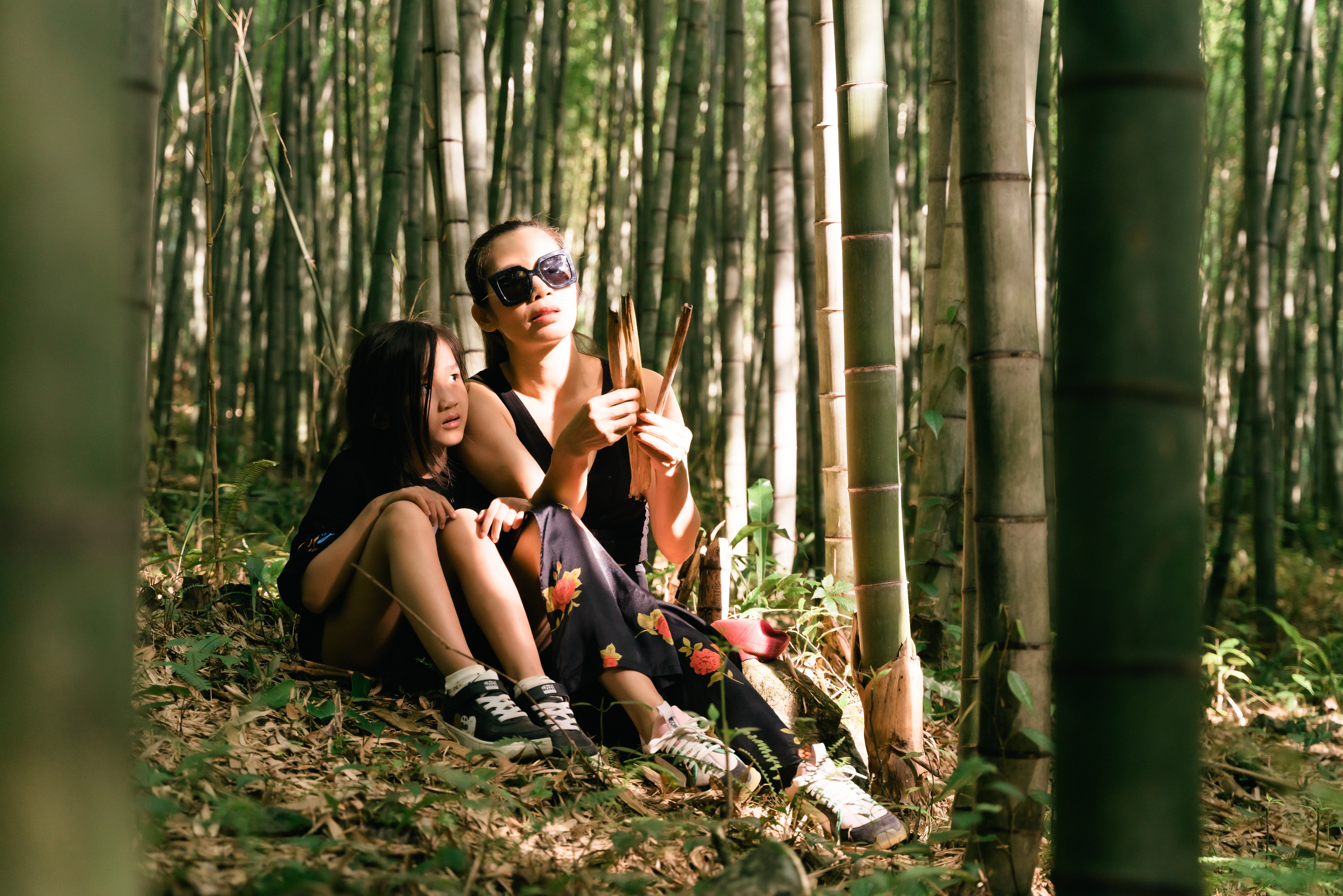 Trên đường đi, ba mẹ con qua rừng trúc Tìa Cố Xi. Khung cảnh rừng trúc thẳng tắp tuyệt đẹp, ánh nắng xuyên qua những chiếc lá trúc lấp lánh khiến chị Hằng mê mẩn không muốn rời.