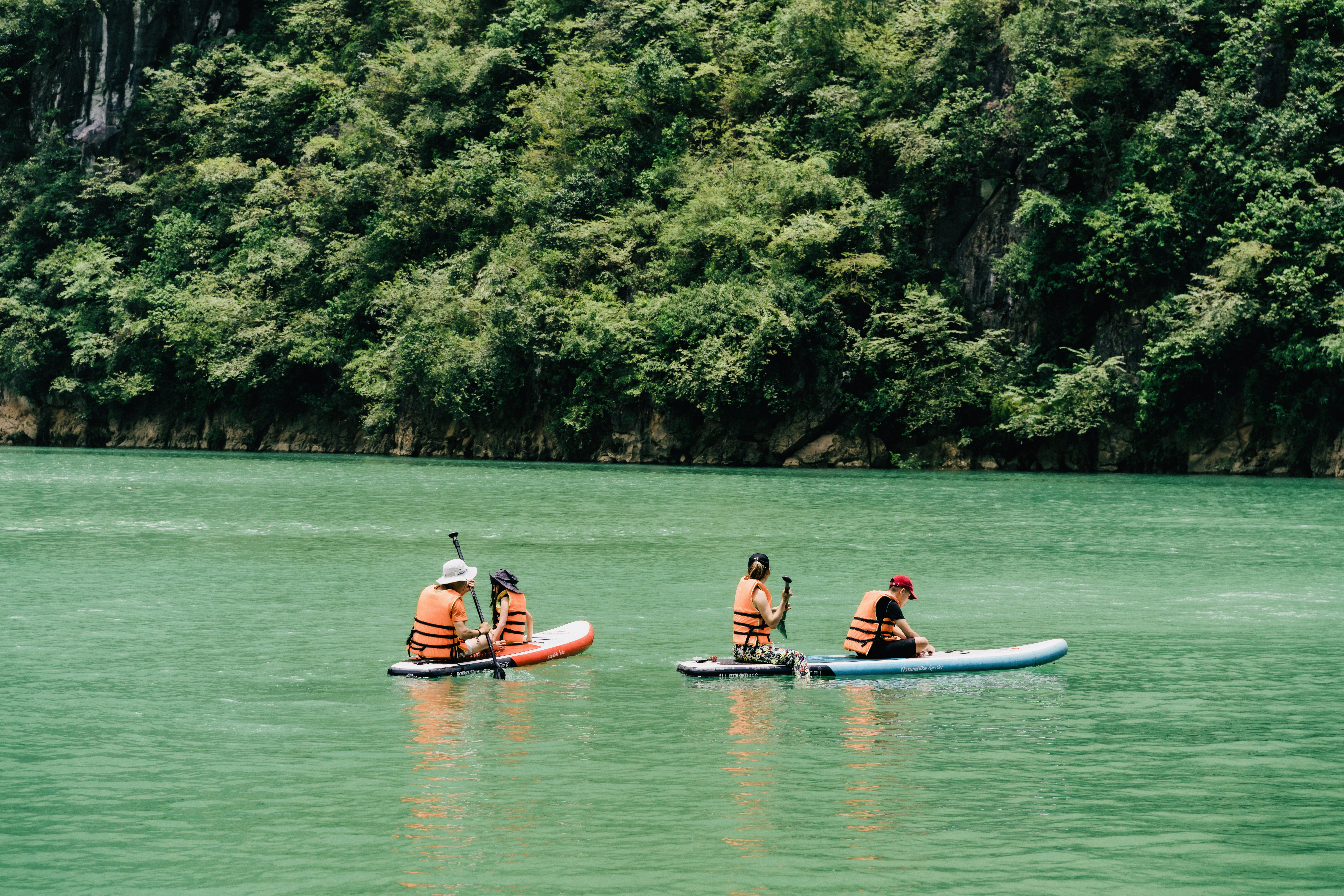 Để xuống khu vực này, ba mẹ con phải đi bộ hàng trăm bậc thang để xuống bến thuyền. Đến nơi, mẹ con chị Hằng lôi thuyền SUP ra bơi, nhảy xuống sông tắm. "Đang nắng nóng được thả mình xuống dòng sông mát lạnh khiến mình nhớ về trải nghiệm vài năm trước tại Nga. Khi ấy, vừa xông hơi xong, mình cũng nhảy bùm xuống hồ băng lạnh ngắt", chị Hằng kể. Bé Mây sung sướng khi được bơi thỏa thích ở "hồ bơi đặc biệt", nằm giữa những vách đá cao khổng lồ.