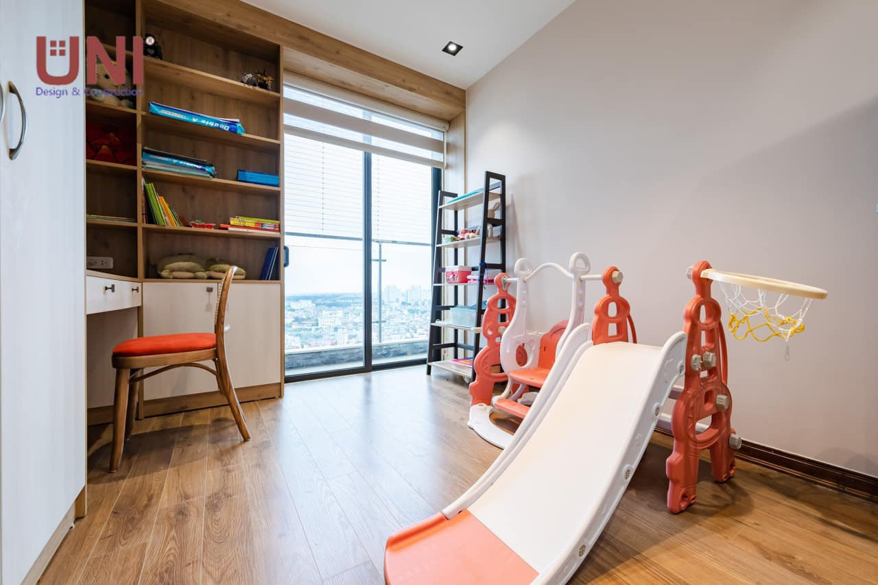 Phòng đa năng làm chỗ chơi cho bé, góc học tập và khi có khách sẽ trở thành phòng ngủ kiểu Nhật. Chị Hằng cho làm tủ kịch trần, cất đồ chơi, chăn, màn chưa dùng... để phòng luôn ngăn nắp.