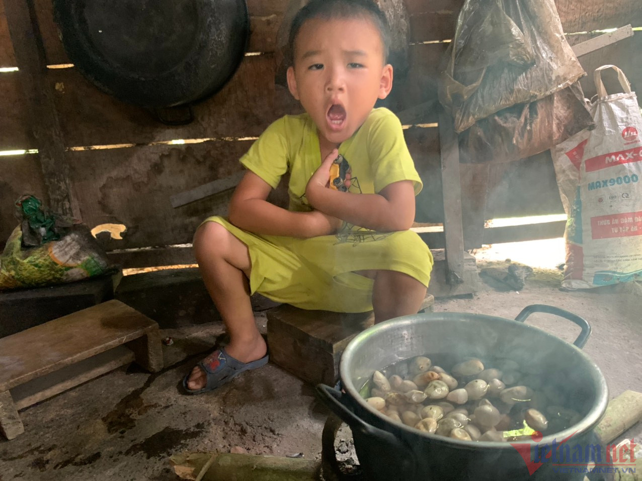 Nước mắt lưng tròng, chị Cao Thị Cương (SN 1985) kể: "Sáng nay, mẹ định đi làm thuê nhưng mệt quá, bị viêm xoang nặng nên mặt mũi bị sưng. Do nhà không còn gạo, sáng dậy mẹ đã nấu cháo trắng lúc 7h sáng để mấy đứa ăn. Sáng nay các cháu ăn rồi nên phải chờ đến tối mới được ăn tiếp. Mẹ đang luộc hạt mít để các cháu ăn trừ bữa thì vừa lúc mọi người ghé đến".