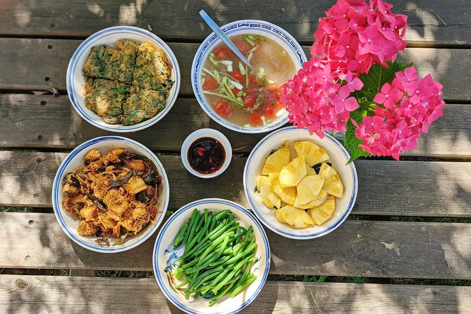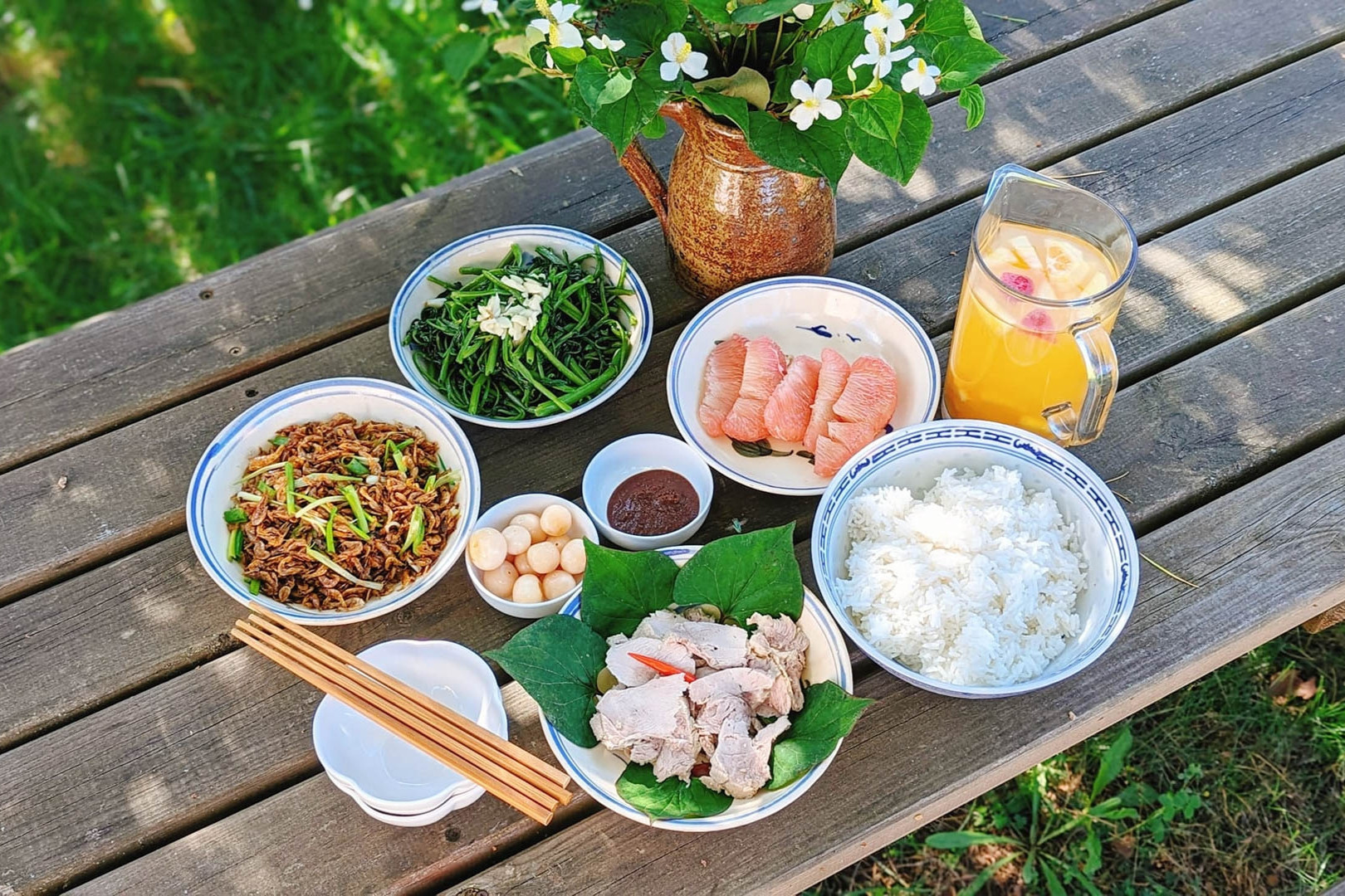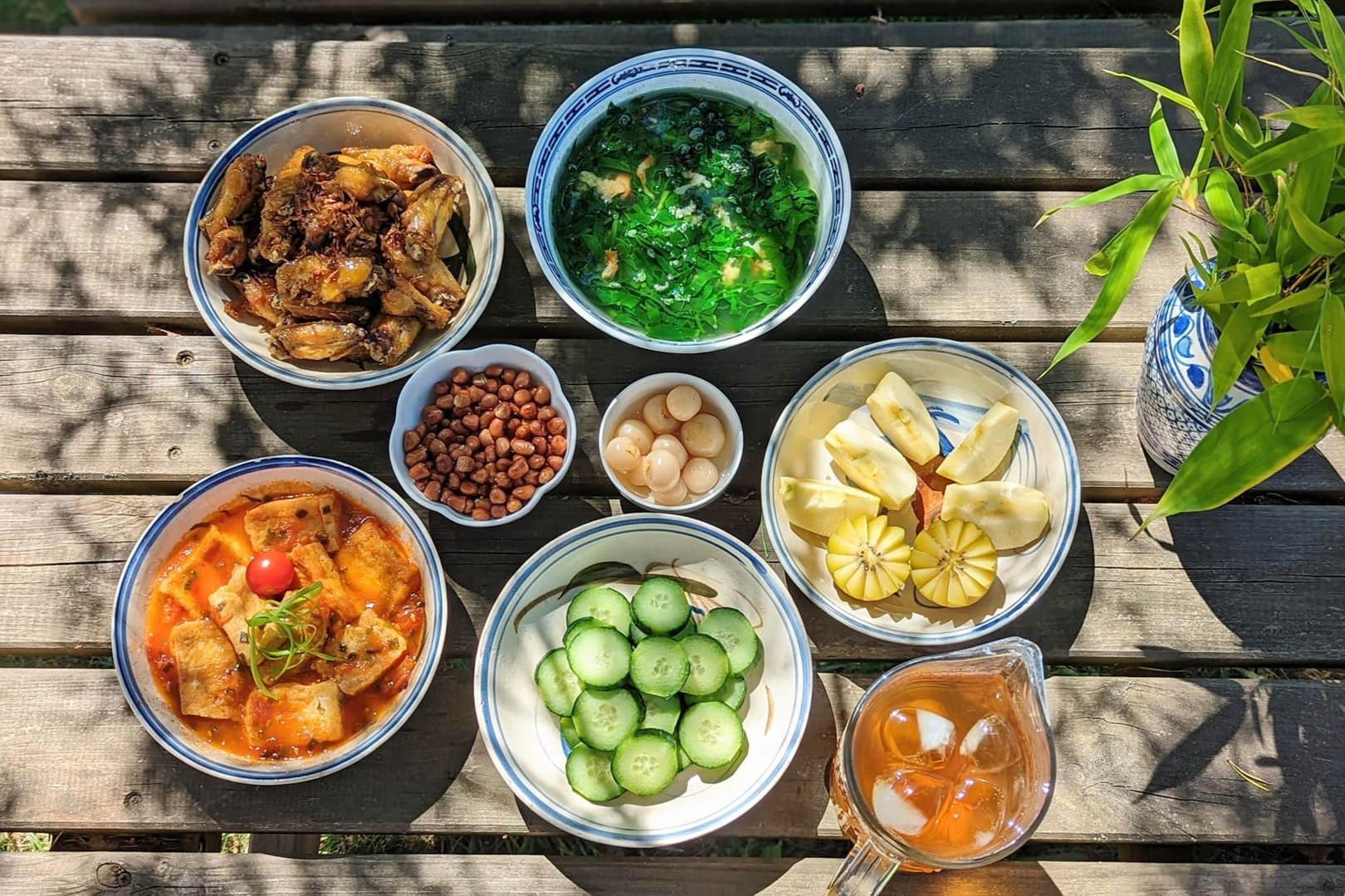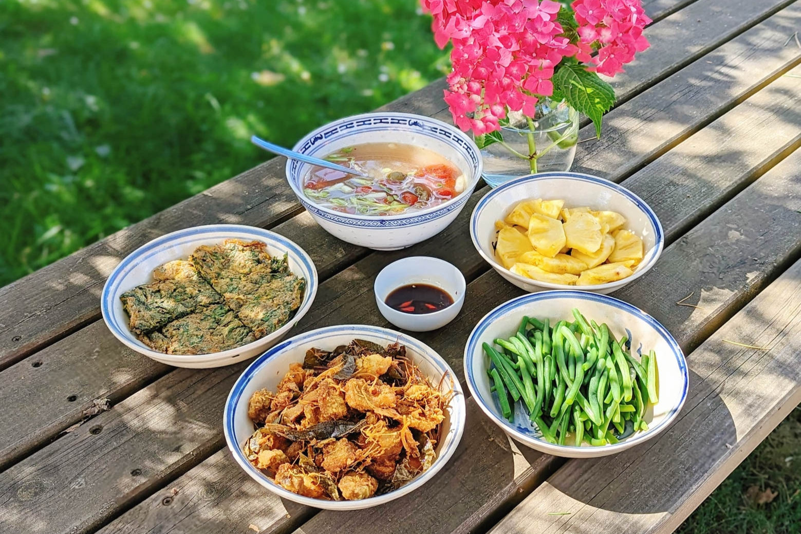 Rau muống luộc, canh chua sấu, cà pháo, thịt ba chỉ rang cháy cạnh, đậu phụ tẩm hành, cá kho tộ, trứng rán lá ngải... là những món ăn Việt được chị Đỗ Linh chăm chút chuẩn bị cho gia đình tại thành phố Toulouse, miền Nam nước Pháp.