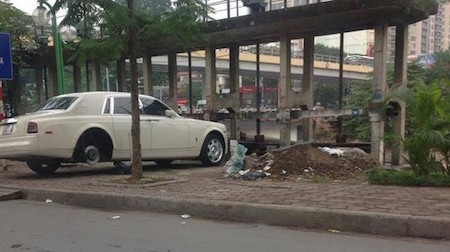 Một chiếc Rolls Royce Phantom nằm lặng lẽ chờ thay bánh trên vỉa hè Hà Nội, bên cạnh là bãi rác. |