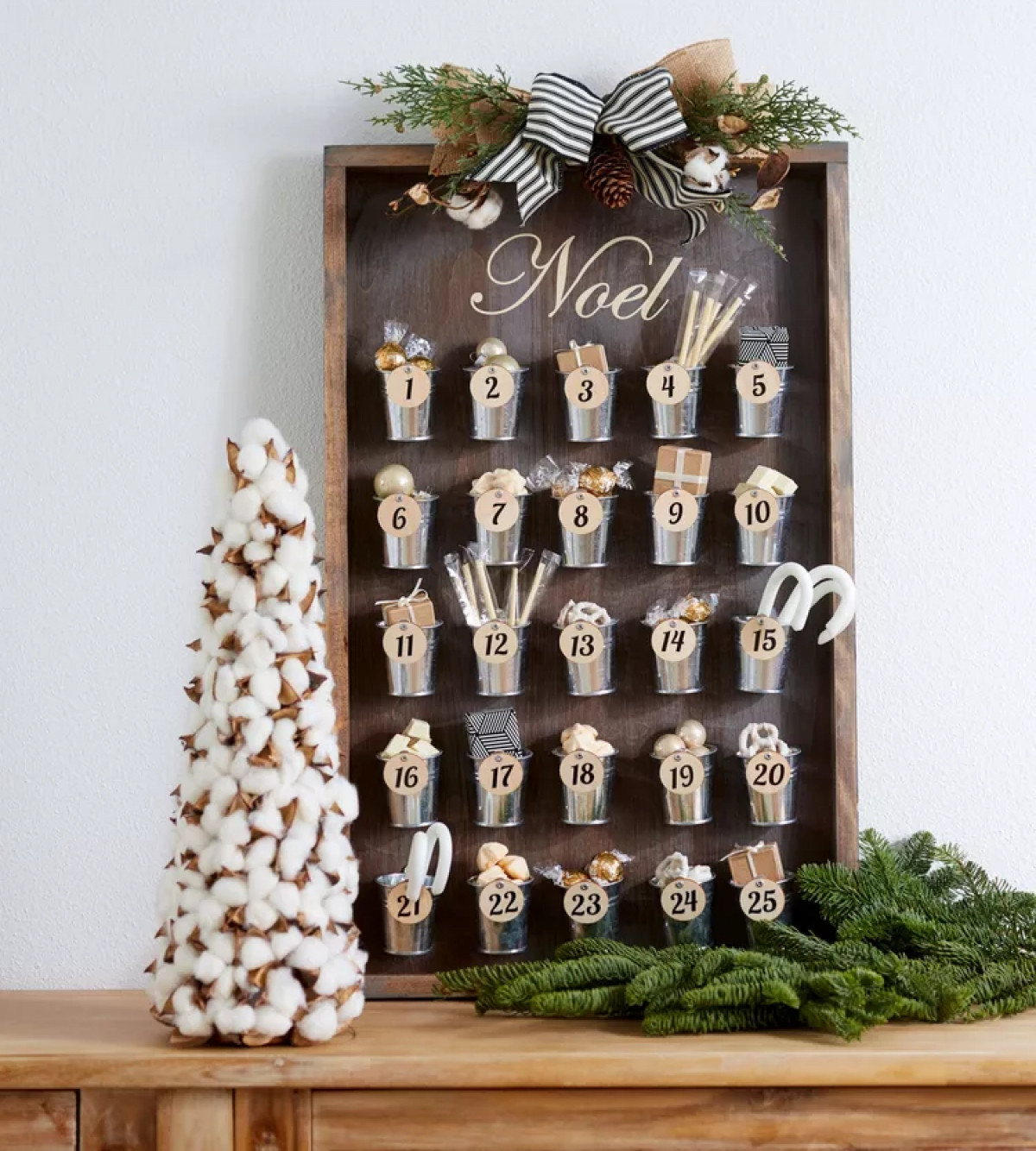 Đếm ngược đến Giáng sinh với lịch handmade treo trên tường. Lịch tự làm này hoàn toàn phù hợp với không khí Giáng sinh ở trang trại, nhưng bạn có thể kết hợp nó với bất kỳ gu thẩm mỹ nào. Để tái tạo diện mạo này, hãy chọn một bảng hiệu Giáng sinh bằng gỗ có khung và sử dụng keo nóng để gắn những chiếc xô, cốc hoặc lọ nhỏ. Thêm các con số và đổ đầy các món quà Giáng sinh vào từng ô để gia đình có thể thưởng thức khi bạn đếm ngược ngày ông già Noel đến.