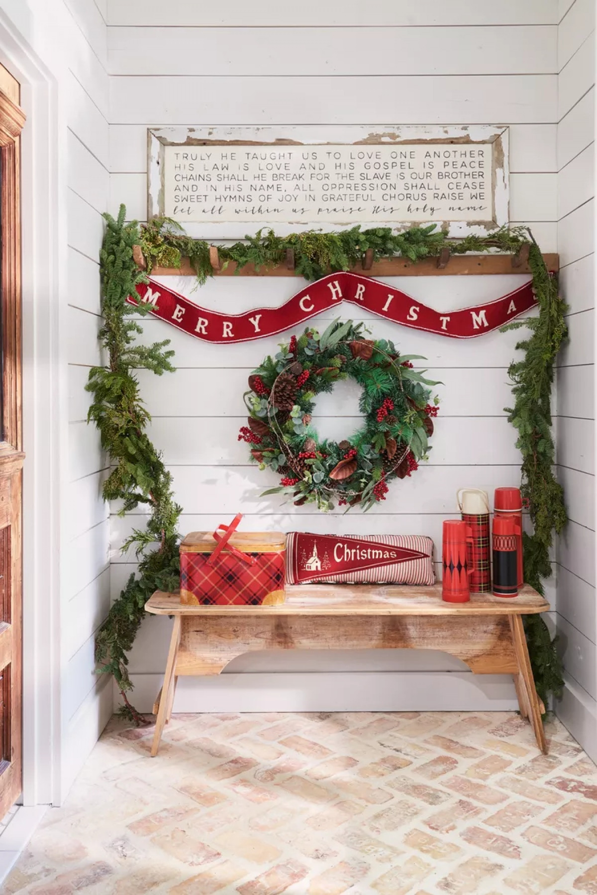 Những bức tường ngoài trời cũng xứng đáng được hưởng một chút niềm vui Giáng sinh! Mang đến cho bạn bè, gia đình và những vị khách trong kỳ nghỉ lễ của bạn một sự chào đón chân thành với cách trang trí hiên nhà với không khí lễ hội tưng bừng. Thể hiện tinh thần ngày lễ bằng vòng hoa màu xanh lá cây, vòng hoa truyền thống và treo lên biểu ngữ Giáng sinh. Hãy chuẩn bị sẵn thêm một chiếc giỏ dã ngoại cổ điển dễ thương và một vài bình giữ nhiệt, sẵn sàng thưởng thức ca cao nóng ấm vào một ngày đông lạnh giá.
