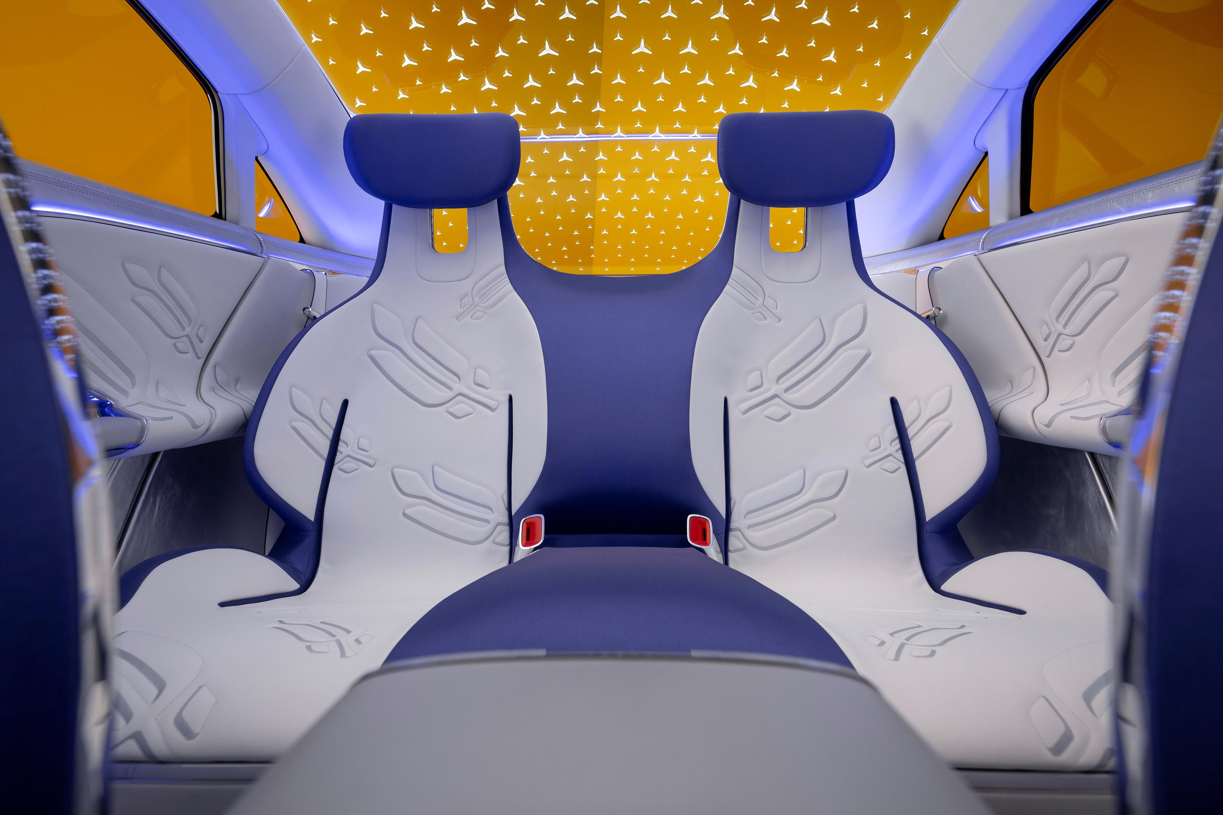 Nội thất của Concept CLA Class chịu ảnh hưởng từ Vision EQXX, bao gồm các chất liệu thân thiện với môi trường cũng như màn hình siêu rộng Superscreen. Chất liệu bọc ghế có màu bạc và trắng, vốn làm từ da Nappa và được nhuộm bằng vỏ cà phê, đi kèm vải nền màu tím lấp lánh được làm từ nhựa PET tái chế. Họa tiết vòng hoa nguyệt quế cổ điển trên logo Mercedes-Benz cũng được thêu nổi trên bề mặt ghế.