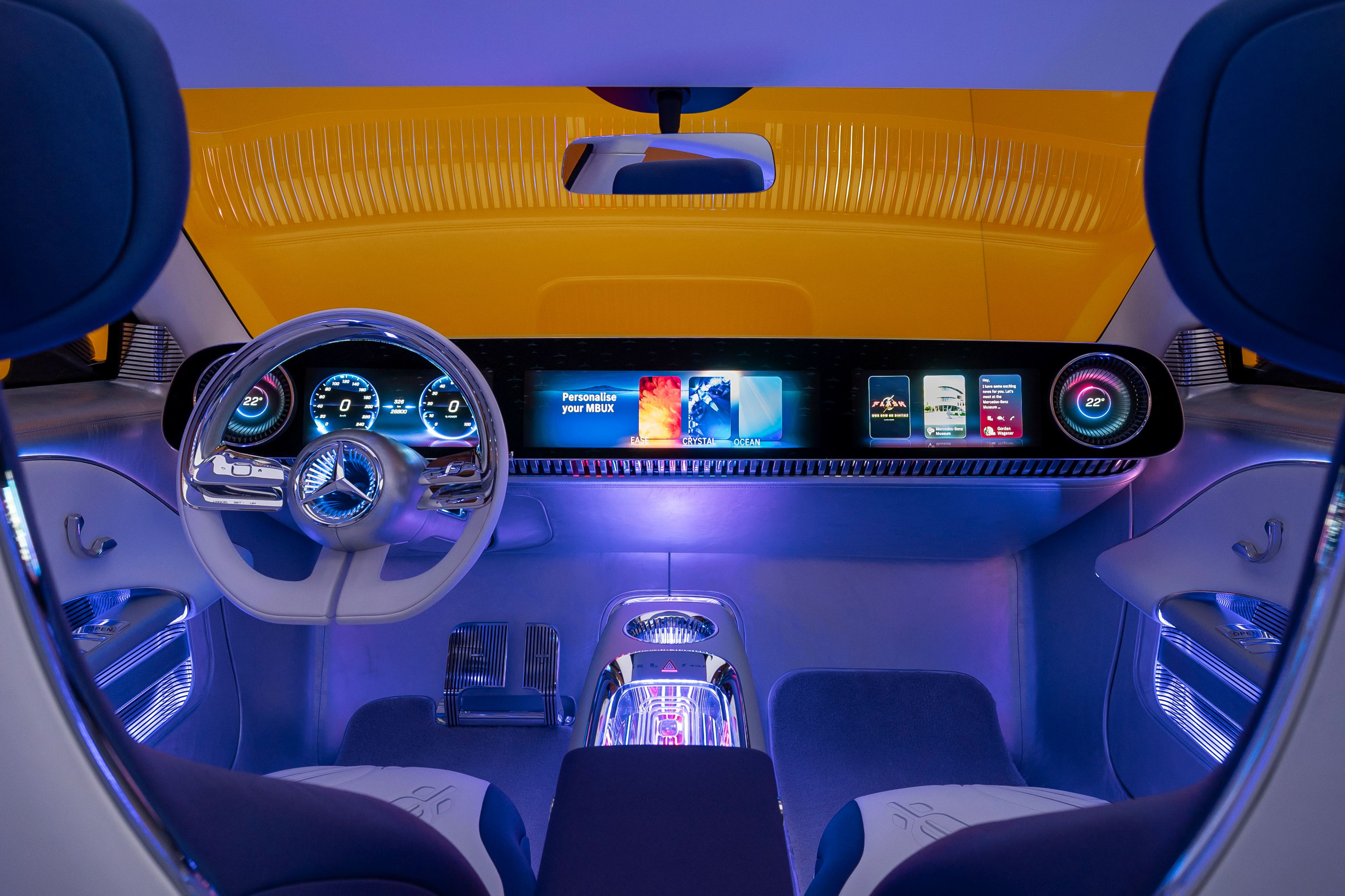 Màn hình siêu rộng Superscreen của Concept CLA Class bao gồm 3 khu vực riêng biệt: bảng đồng hồ taplo kỹ thuật số, màn hình giải trí trung tâm và màn hình phụ trợ tại ghế hành khách. Hệ thống điều hòa 2 vùng được điều khiển bởi 2 phím xoay dạng turbine với cửa gió được nằm ẩn phía sau màn hình Superscreen. Hệ thống điều hành MB.OS mới sở hữu bộ vi xử lý được làm mát bằng chất lỏng, vốn được lắp đặt ngay tại bệ điều khiển trung tâm, giúp cải thiện tốc độ hoạt động cũng như mang đến đồ họa sắc nét hơn.