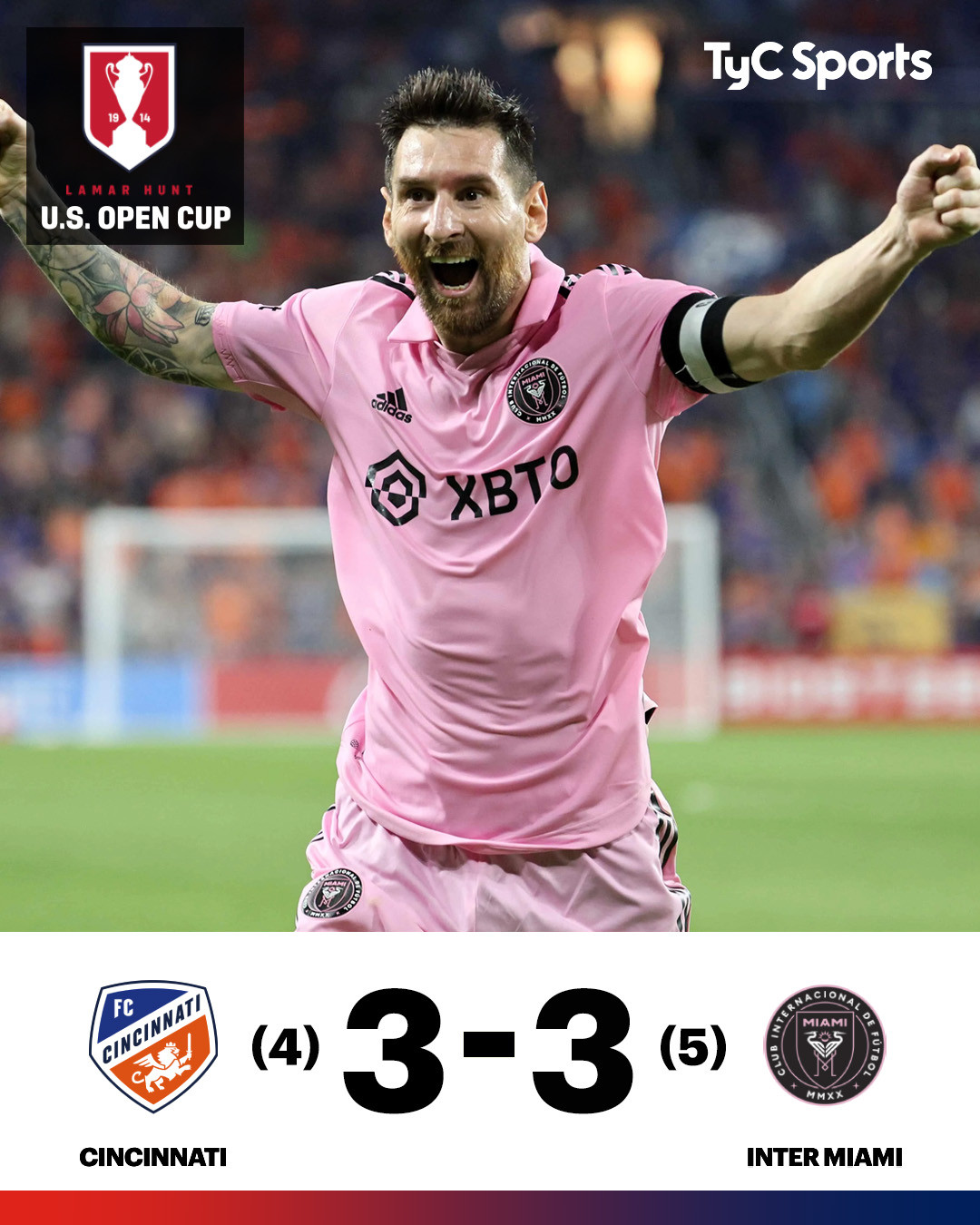 Đội hình ra sân Inter MiamiMessi thu hút sự chú ý của người hâm mộCincinnati nhập cuộc ấn tượng hơnĐội chủ nhà vượt lên dẫn trước trong hiệp 1 nhờ công AcostaNgay đầu hiệp 2, Vazquez nhân đôi cách biệt cho CincinnatiĐúng vào lúc khó khăn nhất, Messi lại tỏa sángTiền đạo Argentina kiến tạo 2 đường chuyền đẳng cấp cho Campana lập cú đúp san hòa 2-2Bước vào hiệp phụ, Inter Miami lần đầu tiên vượt lên dẫn 3-2 nhờ công MartinezPhút 114, Kubo đẩy kịch tính lên cao trào với bàn gỡ 3-3, buộc hai đội phải vào đá luân lưu cân nãoMessi thực hiện quả penalty đầu tiên thành côngInter Miami thắng 5-4 đầy cảm xúc trên chấm luân lưuThủ thành Callender ôm Messi ăn mừng sau khi lọt vào chung kết US OpenMessi đứng trước cơ hội lớn giành chiếc cúp thứ hai cùng Inter MiamiHLV Tata Martino không giấu được niềm vui sướng và hạnh phúc khi có học trò như MessiChiến thắng nghẹt thở của đội bóng áo hồng