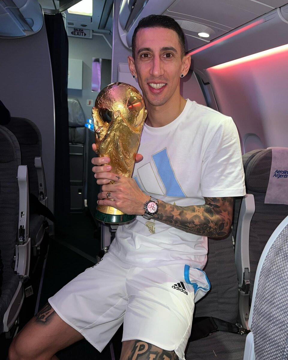 Các đồng đội Messi như Di Maria, Lisandro Martinez, Emiliano Martinez cũng tranh thủ tạo dáng bên cúp vàng khi họ vút bay lên bầu trời.