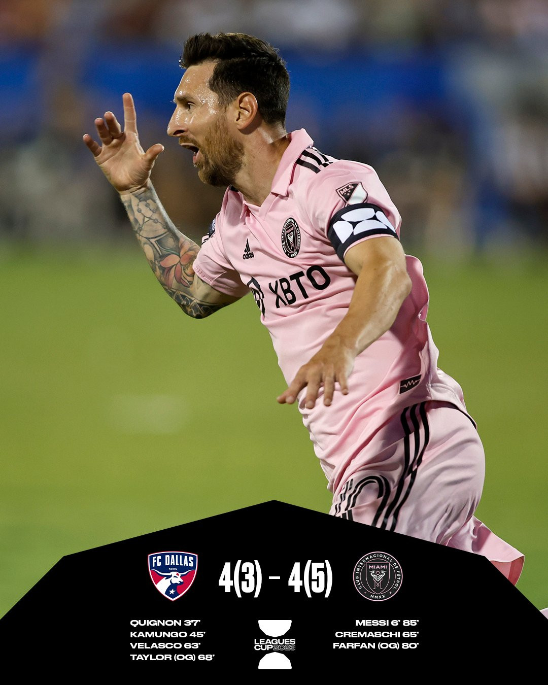 Lionel Messi ghi 2 bàn tuyệt đẹp trong trận hòa 4-4 của Inter Miami trước Dallas và giúp đội bóng của David Beckham thắng 5-3 trên chấm penalty.