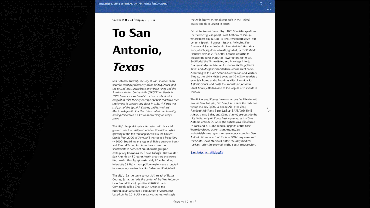Font Skeena là sản phẩm của John Hudson và Paul Hanslow, kết hợp từ các xu hướng thiết kế font trong lịch sử. Nét thanh đậm trong từng chữ cái được thể hiện rõ ràng, bên cạnh đường cong mạnh của một số chữ như S, A và J. |