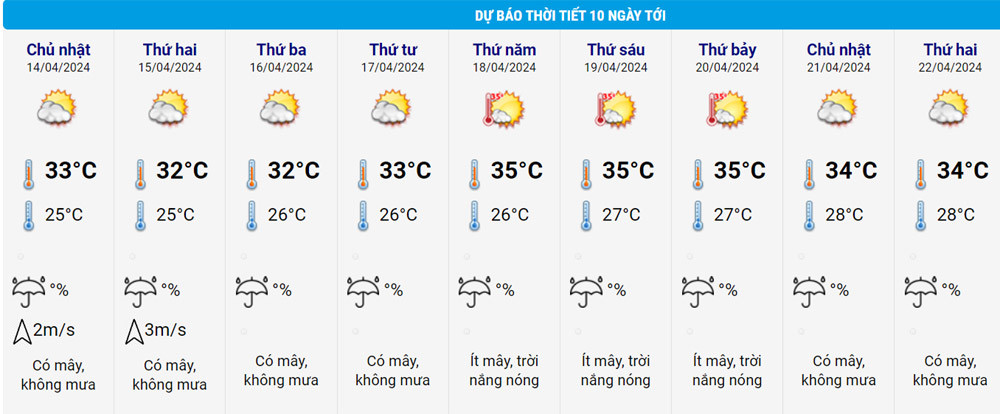 Từ 14-15/4, ngày nắng, khu vực vùng núi phía Tây có nắng nóng.