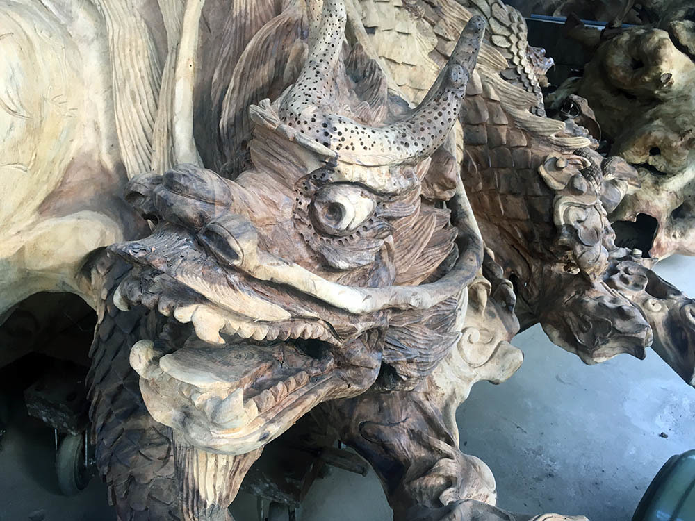 | Một số phần phụ của bộ gốc, rễ bàng cổ thụ đã được ông Mai Kiên điêu khắc thành hình đầu rắn, rồng, quy, phụng,... rất đẹp mắt |