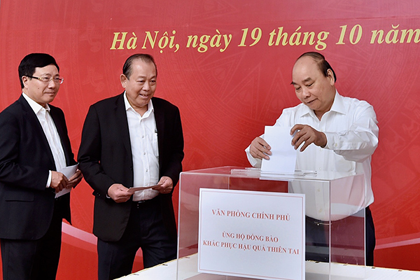 7h20 sáng nay (19/10), Thủ tướng Nguyễn Xuân Phúc, các Phó Thủ tướng và Văn phòng Chính phủ quyên góp ủng hộ đồng bào miền Trung đang gặp nhiều thiệt hại do đợt mưa lũ lịch sử gây ra.