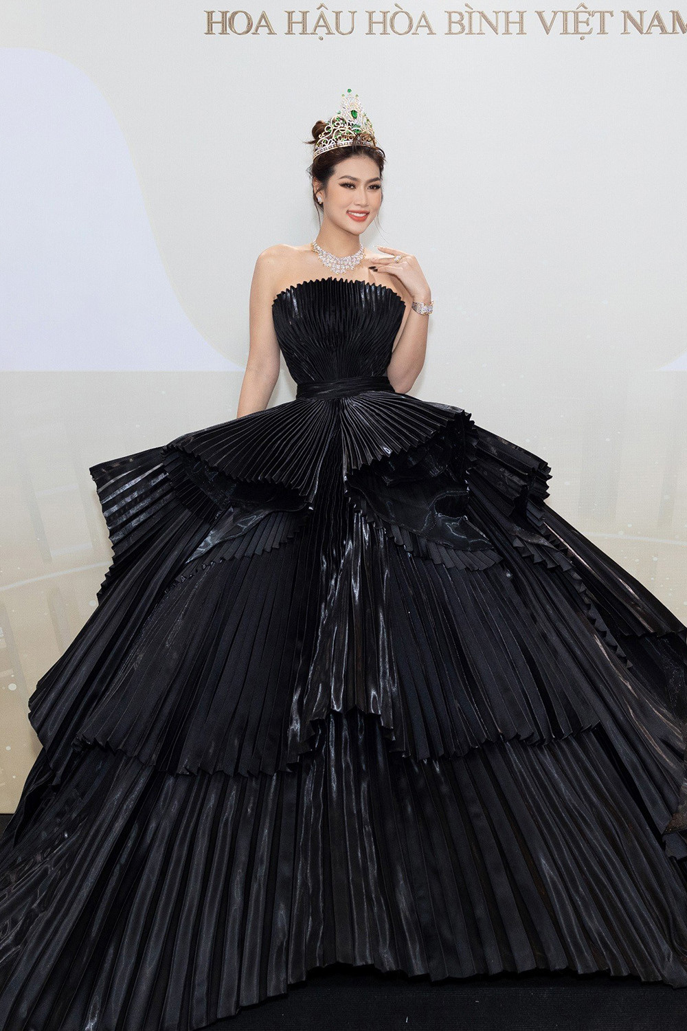 Đương kim Hoa hậu Hòa bình Việt Nam Đoàn Thiên Ân đội vương miện, diện đầm đen cúp ngực nhiều tầng. Đêm nay, Thiên Ân chính thức kết thúc nhiệm kỳ, trao lại vương miện Hoa hậu Hoà bình Việt Nam cho người kế nhiệm. Đương kim Hoa hậu Hoà bình Quốc tế Isabella Menin sắc sảo trong đầm dạ hội ôm sát tông vàng, xanh lá, đính đá lấp lánh. Hoa hậu Thuỳ Tiên tạo sự khác biệt khi hoá ’nữ thần’ cùng trang phục độc đáo, với phần thân dưới xẻ cao làm từ vải voan.