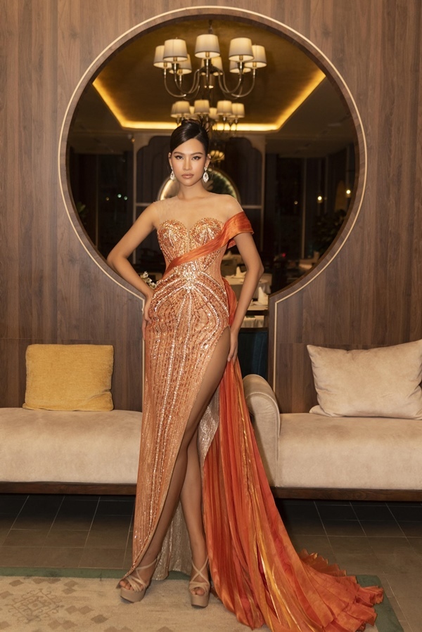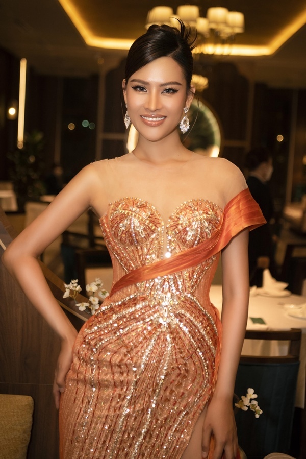 Miss Earth Vietnam 2020 chọn thiết kế váy màu cam đính kết tỉ mỉ cùng phần tà váy lộng lẫy. Cô có dịp hội ngộ nhiều ngôi sao như Hà Kiều Anh, Vũ Hoàng My, Hoàng Hạnh…