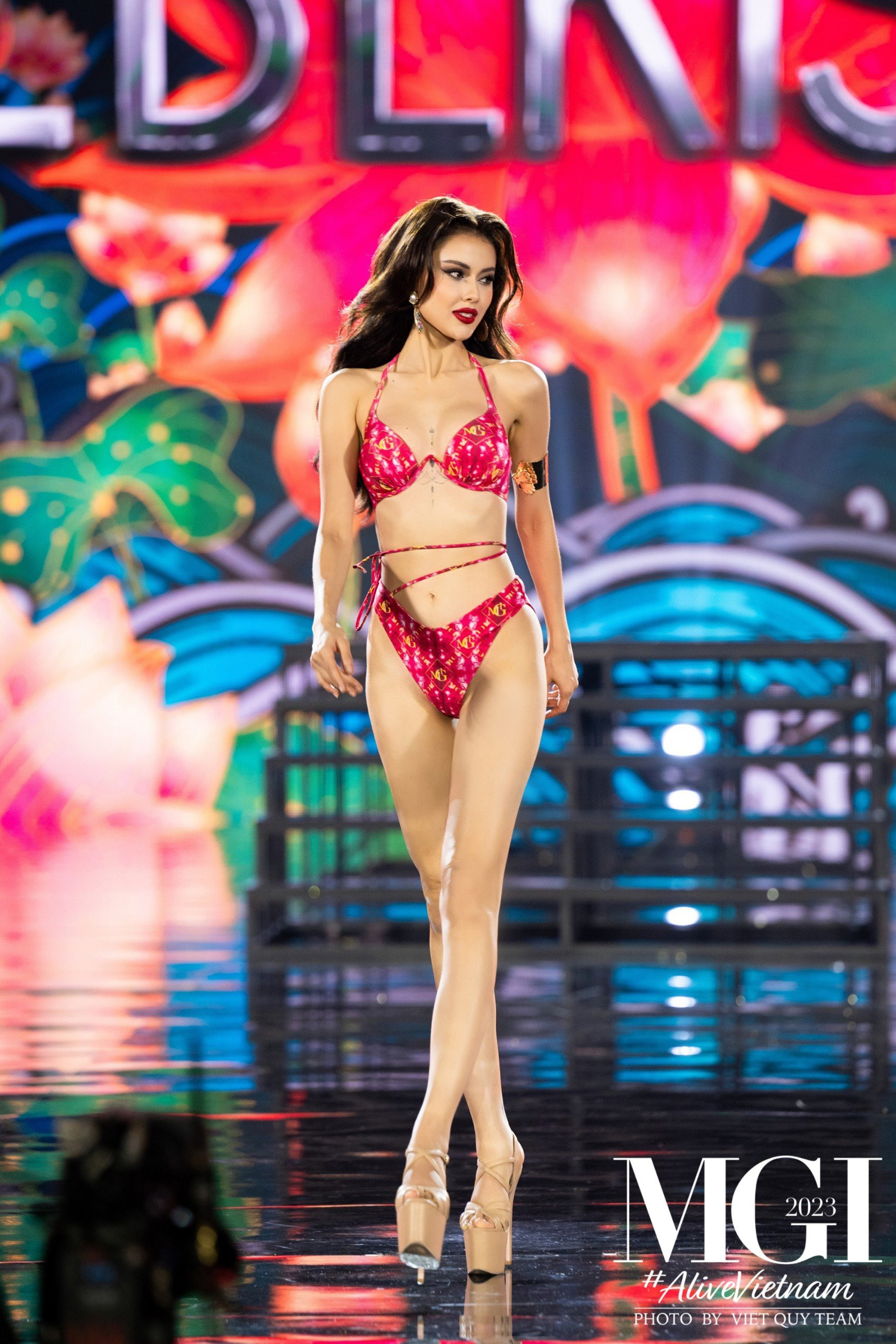 Trong đêm chung kết Miss Grand International, Top 20 thí sinh bước vào phần thi áo tắm. Dàn người đẹp diện trang phục áo tắm 2 mảnh màu hồng, khoe hình thể quyến rũ và kỹ năng catwalk cuốn hút. Hầu hết thí sinh đều kết hợp các động tác xoay, múa tay, nhún chân để tạo điểm nhấn cho phần trình diễn.