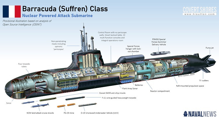 Tàu ngầm tấn công chạy bằng năng lượng hạt nhân Suffren thuộc lớp Barracuda được Pháp tiến hành đóng từ năm 2007 và hạ thủy vào tháng 8/2019. Tàu có chiều dài 99,5m; sườn ngang 8,8m; mớn nước 7,3m. Trọng tải tối đa là 5.300 tấn.