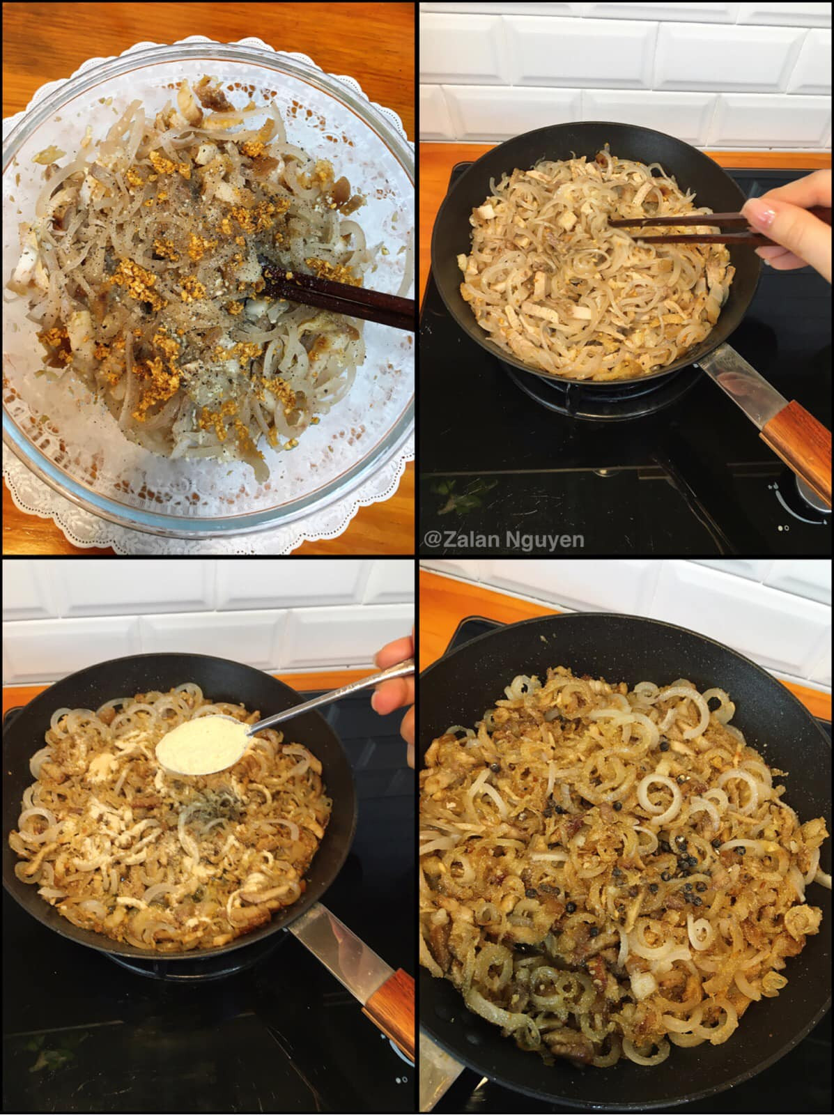Cho hỗn hợp lên bếp xào qua rồi thêm thính, hạt tiêu vào là được. Khi nem còn ấm thì gói lại bằng màng bọc thực phẩm, vài tiếng sau có thể ăn ngay.