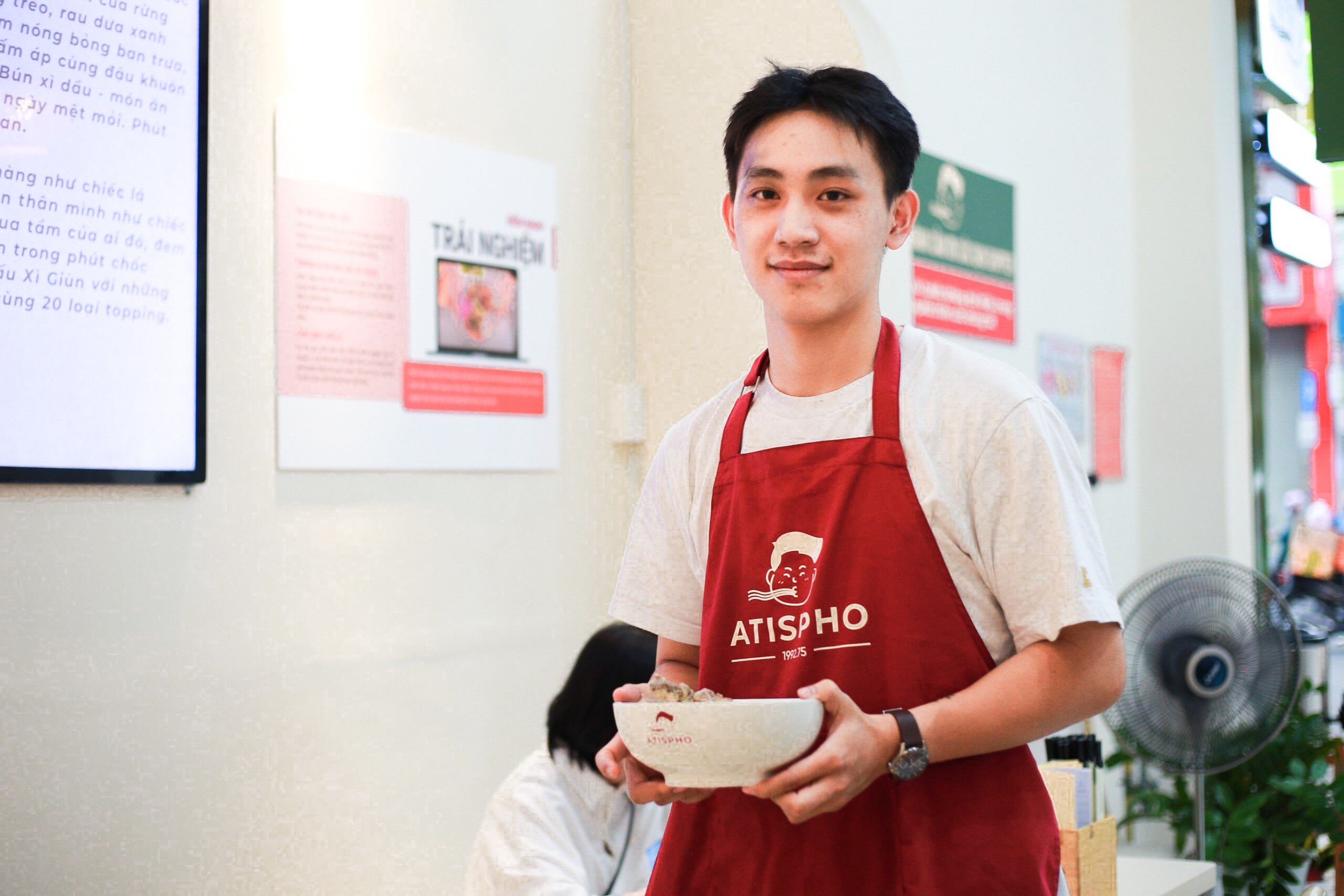 Chủ quán 22 tuổi cho biết, gia đình anh không có truyền thống kinh doanh ẩm thực. Ý tưởng mở quán phở atiso xuất phát từ niềm yêu thích phở và món canh sườn hầm thân atiso xanh Đà Lạt của mẹ suốt thời thơ ấu.