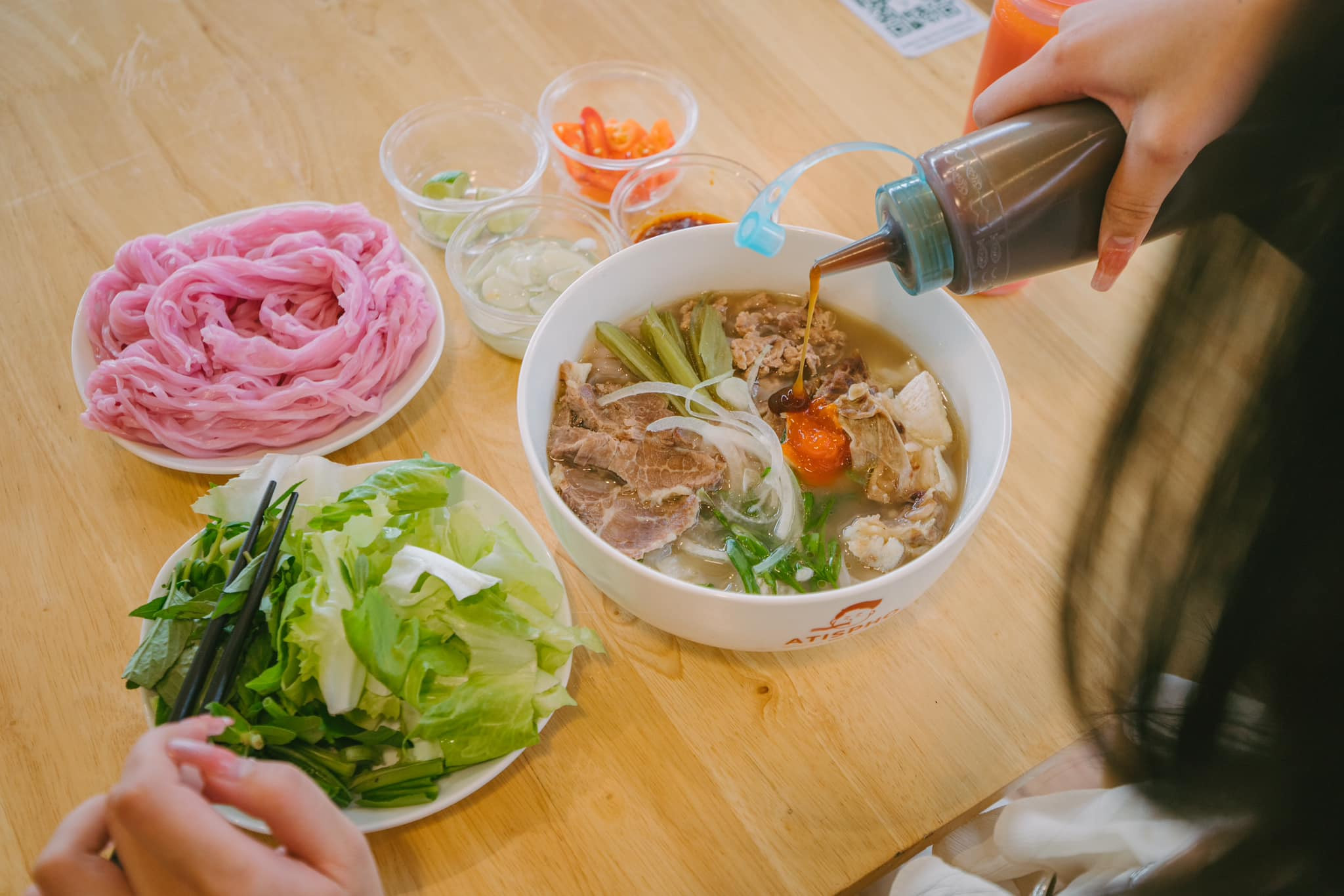 Vị khách đầu tiên tới "mở hàng", chủ quán 22 tuổi nhanh tay trụng phần bánh phở màu đỏ tươi lạ mắt trong nồi nước sôi, đặt phở vào tô rồi khéo léo xếp đầy ắp thịt bò, gân bò, sườn ninh và từ từ chan phần nước dùng bốc khói. Mùi nước dùng thoang thoảng hương atiso đặc trưng, lan tỏa khắp quán phở nhỏ.